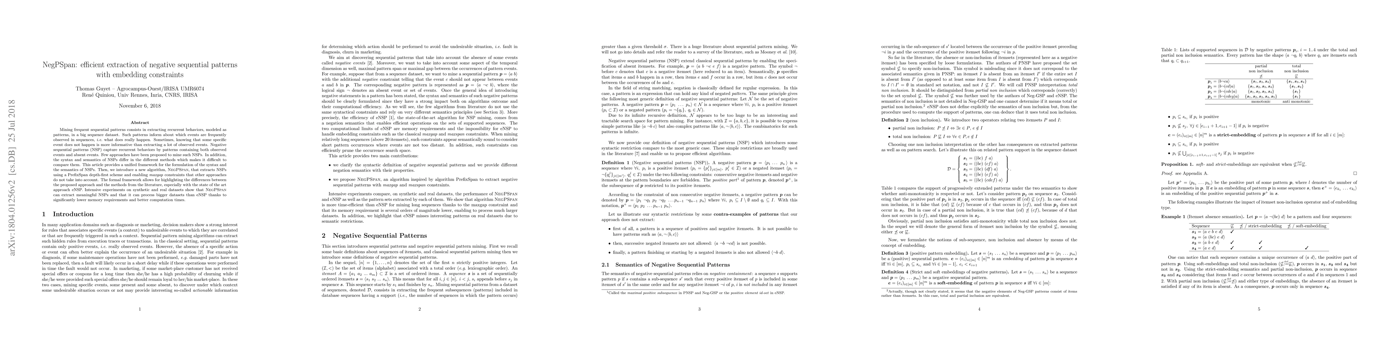 This paper introduces NegPSpan, a novel algorithm for extracting negative sequential patterns (NSPs) that incorporate both observed and absent events, using a PrefixSpan depth-first scheme and maxgap constraints. The proposed framework unifies the syntax and semantics of NSPs, enabling better comparison to existing methods, and demonstrates superior performance in terms of memory usage and computation time on both synthetic and real datasets.