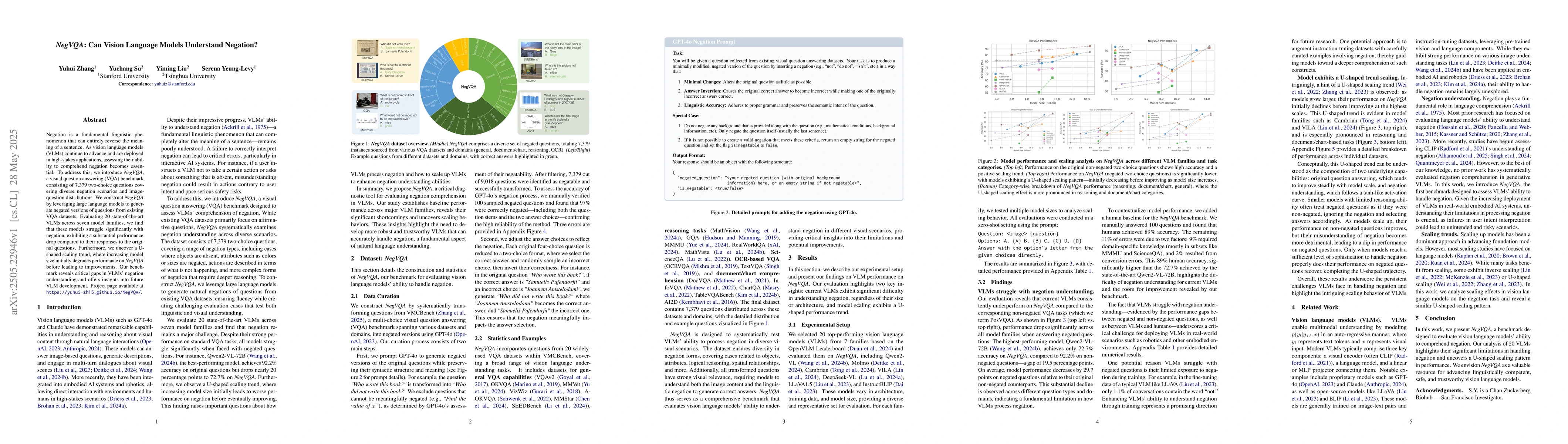 This work stands out by specifically targeting the evaluation of negation understanding in VLMs, an aspect not previously thoroughly examined, and by identifying a U-shaped scaling trend in model performance.