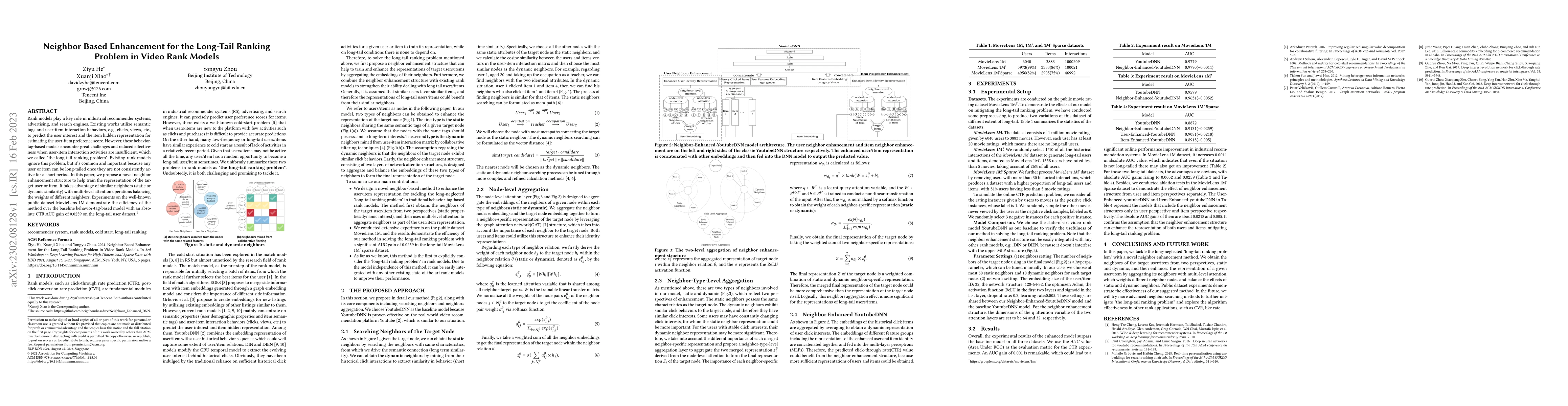 This paper proposes a neighbor-based enhancement structure to address the long-tail ranking problem in rank models, leveraging similar neighbors with multi-level attention to improve representation training. Experimental results on MovieLens 1M show a 0.0259 absolute CTR AUC gain over baseline models for long-tail users.