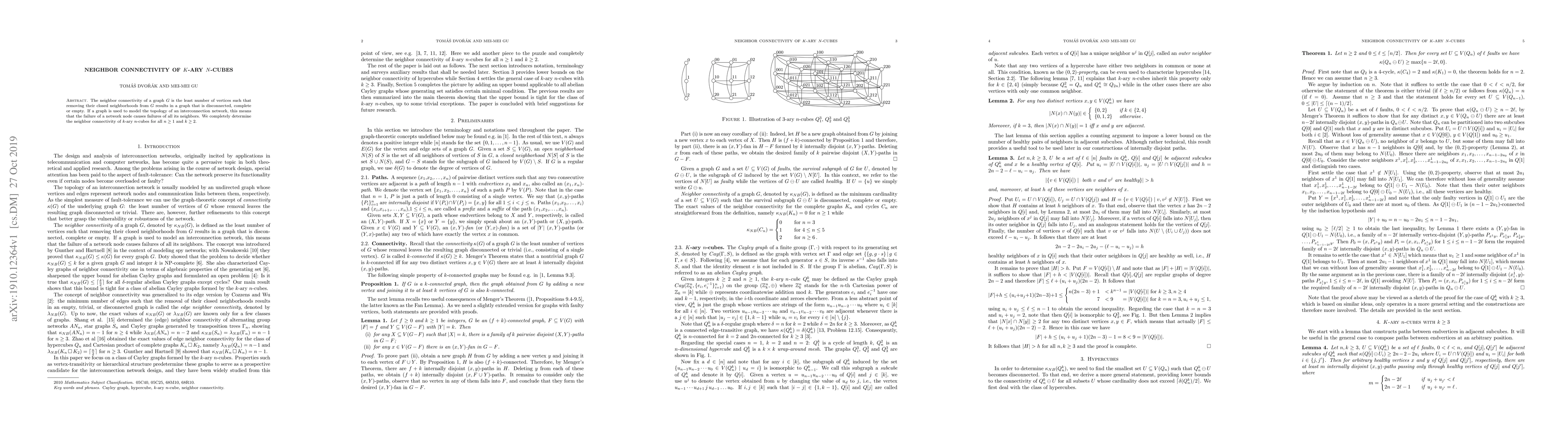 Researchers have determined the neighbor connectivity of k-ary n-cubes for all n >= 1 and k >= 2, finding that removing a certain number of vertices can disconnect the graph into smaller components.
