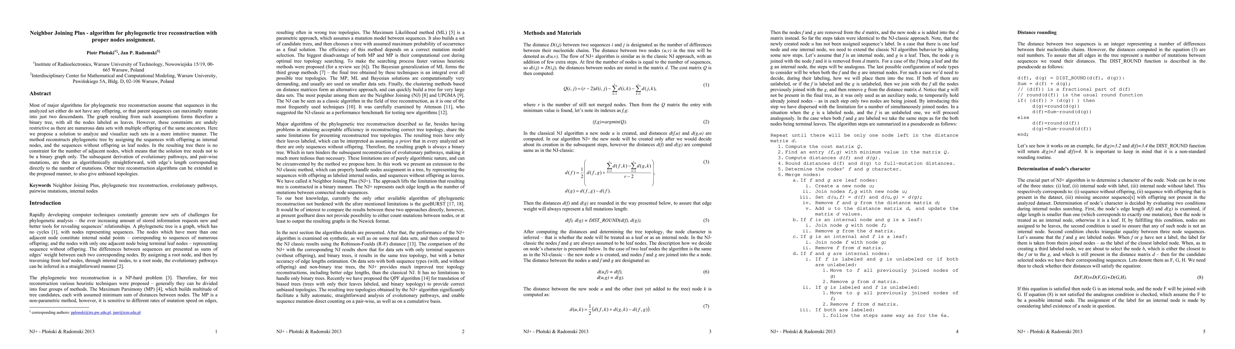 The Neighbor Joining Plus algorithm reconstructs phylogenetic trees by allowing internal nodes to have multiple descendants, thus accommodating data sets with complex evolutionary histories beyond binary trees. This method provides a more flexible framework for visualizing evolutionary pathways, with edge lengths directly representing mutation counts.