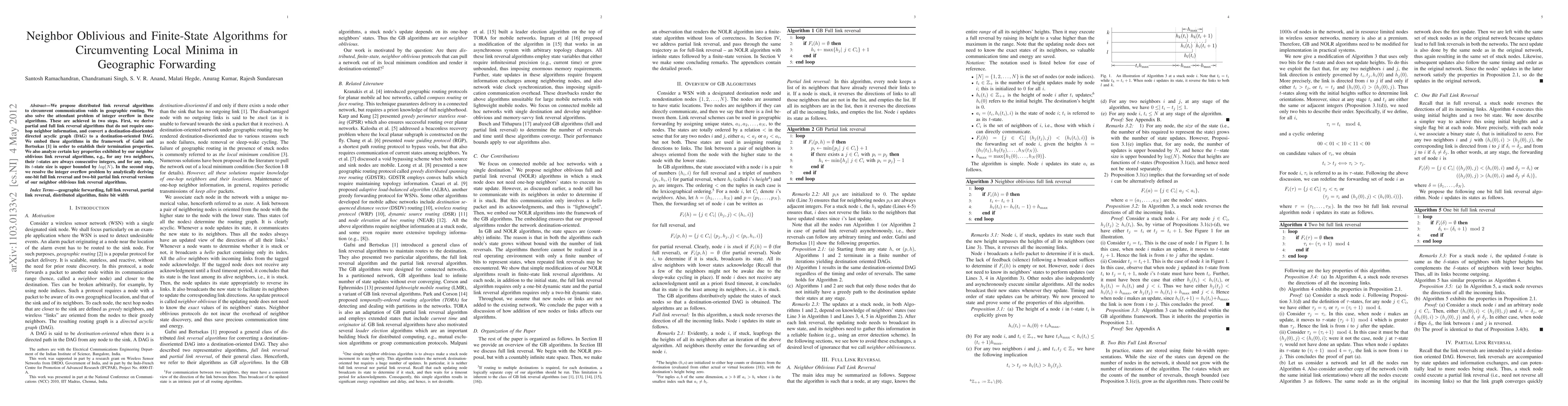 We propose distributed link reversal algorithms to circumvent communication voids in geographic routing. We also solve the attendant problem of integer overflow in these algorithms. These are achieved in two steps. First, we derive partial and full link reversal algorithms that do not require one-hop neighbor information, and convert a destination-disoriented directed acyclic graph (DAG) to a destination-oriented DAG. We embed these algorithms in the framework of Gafni and Bertsekas ("Distributed algorithms for generating loop-free routes in networks with frequently changing topology", 1981) in order to establish their termination properties. We also analyze certain key properties exhibited by our neighbor oblivious link reversal algorithms, e.g., for any two neighbors, their t-states are always consecutive integers, and for any node, its t-state size is upper bounded by log(N). In the second step, we resolve the integer overflow problem by analytically deriving one-bit full link reversal and two-bit partial link reversal versions of our neighbor oblivious link reversal algorithms.