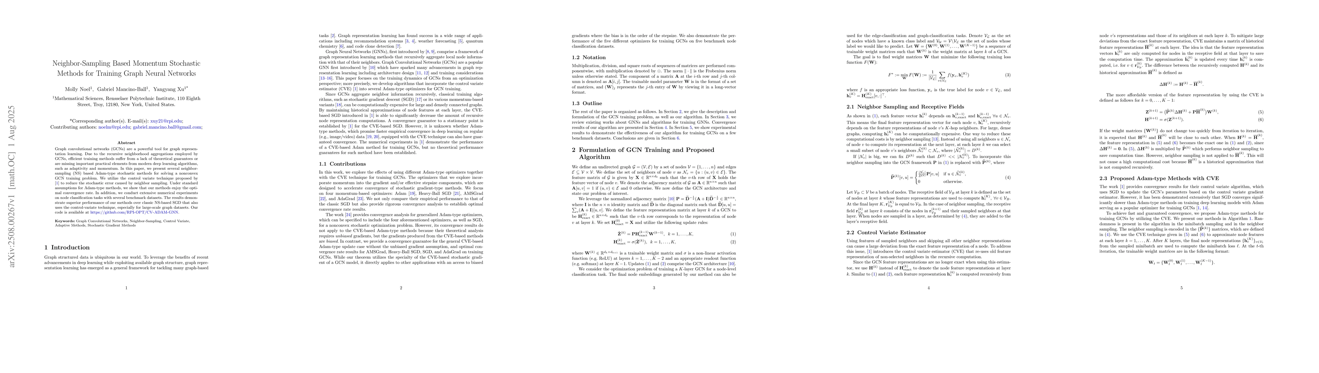 Graph convolutional networks (GCNs) are a powerful tool for graph representation learning. Due to the recursive neighborhood aggregations employed by GCNs, efficient training methods suffer from a lack of theoretical guarantees or are missing important practical elements from modern deep learning algorithms, such as adaptivity and momentum. In this paper, we present several neighbor-sampling (NS) based Adam-type stochastic methods for solving a nonconvex GCN training problem. We utilize the control variate technique proposed by [1] to reduce the stochastic error caused by neighbor sampling. Under standard assumptions for Adam-type methods, we show that our methods enjoy the optimal convergence rate. In addition, we conduct extensive numerical experiments on node classification tasks with several benchmark datasets. The results demonstrate superior performance of our methods over classic NS-based SGD that also uses the control-variate technique, especially for large-scale graph datasets. Our code is available at https://github.com/RPI-OPT/CV-ADAM-GNN .