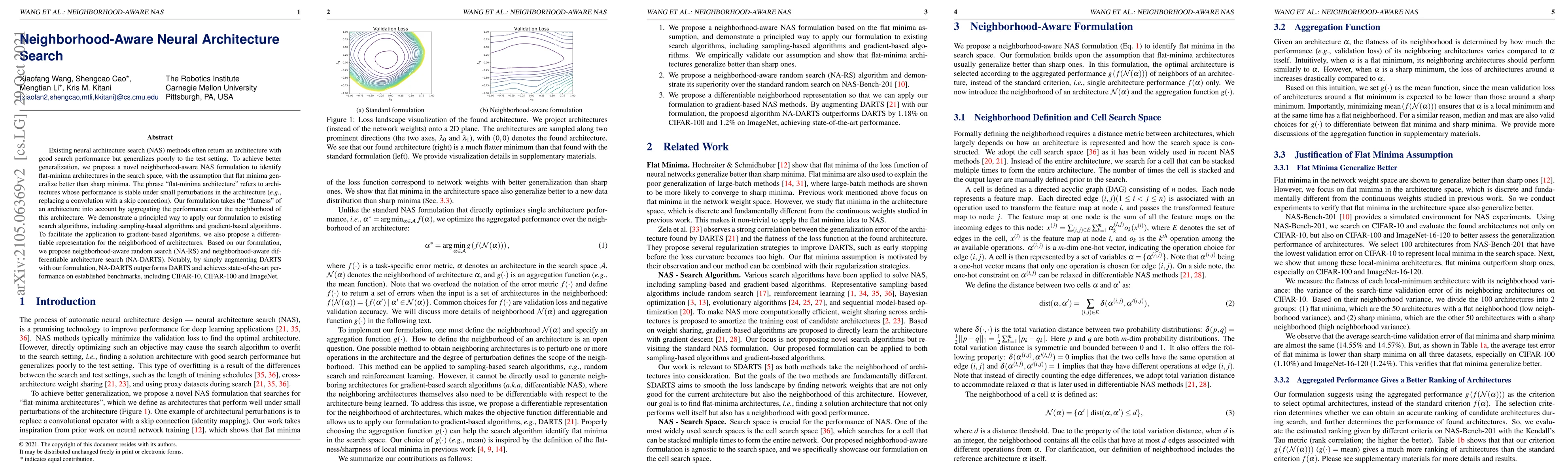 This paper proposes a neighborhood-aware NAS method to identify flat-minima architectures that generalize better. The approach enhances existing search algorithms by incorporating the "flatness" of architectures through performance aggregation over their neighborhoods, leading to improved performance on benchmarks like CIFAR and ImageNet.