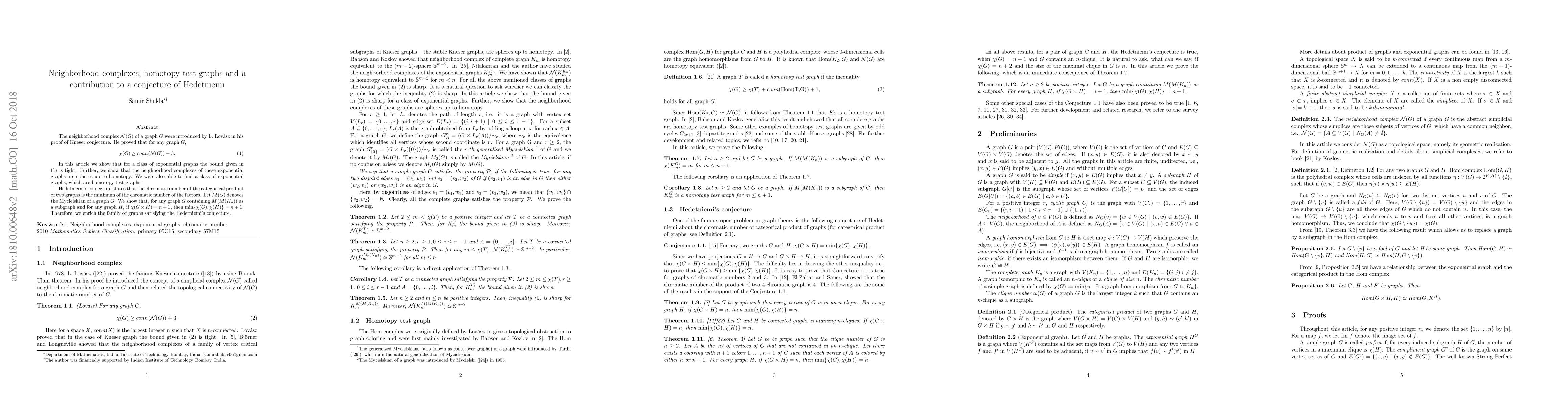 The neighborhood complex $\N(G)$ of a graph $G$ were introduced by L. Lov{\'a}sz in his proof of Kneser conjecture. He proved that for any graph $G$, \begin{align} \label{abstract} \chi(G) \geq conn(\N(G))+3. \end{align} In this article we show that for a class of exponential graphs the bound given in (\ref{abstract}) is sharp. Further, we show that the neighborhood complexes of these exponential graphs are spheres up to homotopy. We were also able to find a class of exponential graphs, which are homotopy test graphs. Hedetniemi's conjecture states that the chromatic number of the categorical product of two graphs is the minimum of the chromatic number of the factors. Let $M(G)$ denotes the Mycielskian of a graph $G$. We show that, for any graph $G$ containing $M(M(K_n))$ as a subgraph and for any graph $H$, if $\chi(G \times H) = n+1$, then $\min\{\chi(G), \chi(H)\} = n+1$. Therefore, we enrich the family of graphs satisfying the Hedetniemi's conjecture.