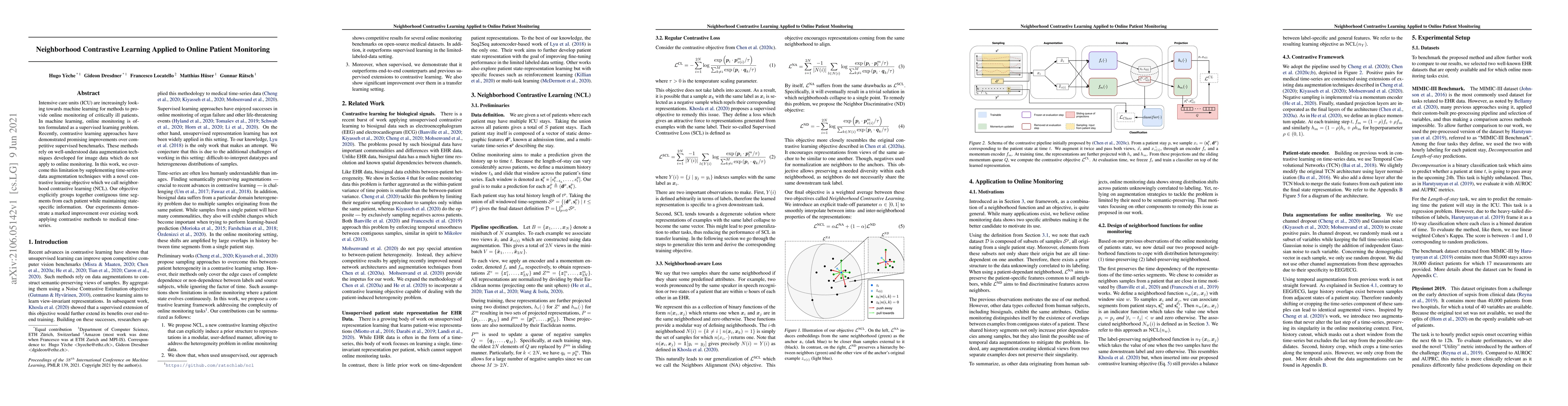 Intensive care units (ICU) are increasingly looking towards machine learning for methods to provide online monitoring of critically ill patients. In machine learning, online monitoring is often formulated as a supervised learning problem. Recently, contrastive learning approaches have demonstrated promising improvements over competitive supervised benchmarks. These methods rely on well-understood data augmentation techniques developed for image data which do not apply to online monitoring. In this work, we overcome this limitation by supplementing time-series data augmentation techniques with a novel contrastive learning objective which we call neighborhood contrastive learning (NCL). Our objective explicitly groups together contiguous time segments from each patient while maintaining state-specific information. Our experiments demonstrate a marked improvement over existing work applying contrastive methods to medical time-series.