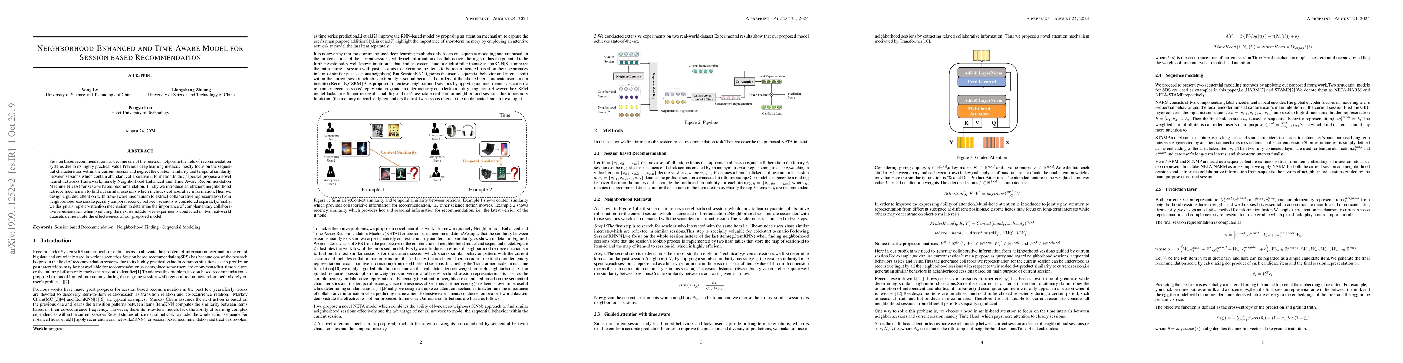 This paper proposes a novel neural network framework called NETA to enhance session-based recommendation by incorporating neighborhood similarity and time-aware mechanisms. It utilizes a neighborhood retrieval approach to find similar sessions and a guided attention mechanism to extract collaborative representations, factoring in temporal recency for improved performance.