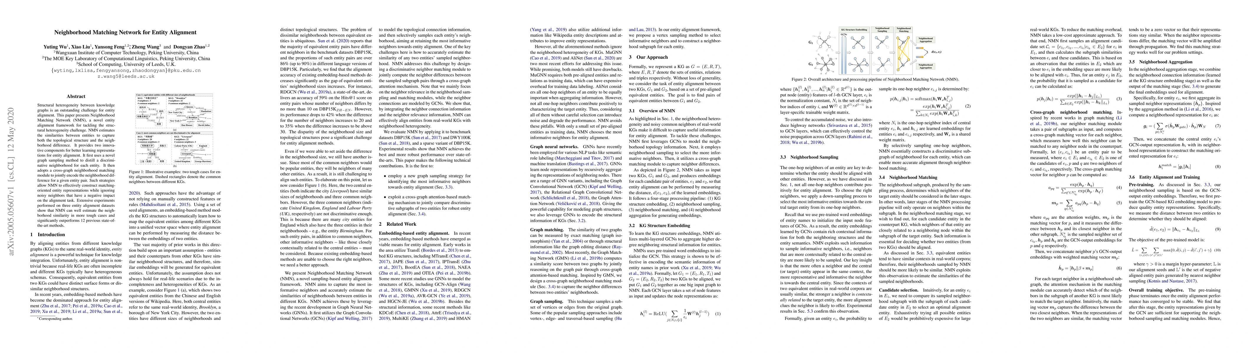 The Neighborhood Matching Network (NMN) tackles structural heterogeneity in knowledge graph alignment by estimating entity similarities through a discriminative graph sampling method and a cross-graph neighborhood matching module, outperforming 12 state-of-the-art methods on three datasets.