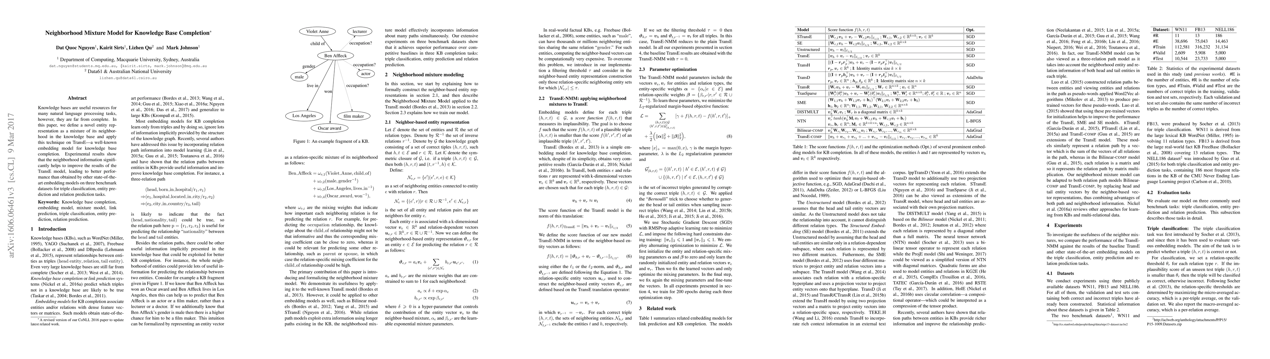 This paper proposes a novel entity representation method that leverages neighborhood mixture information in knowledge bases to enhance TransE embeddings for completion. Experimental results demonstrate superior performance over other state-of-the-art models on benchmark datasets for triple, entity, and relation prediction tasks.