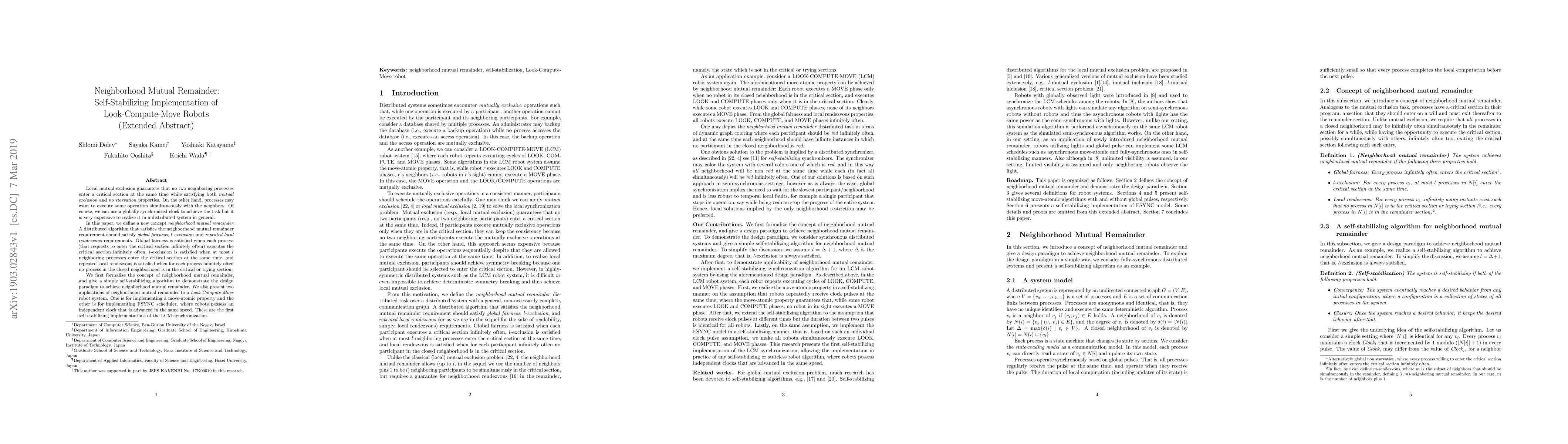 Local mutual exclusion guarantees that no two neighboring processes enter a critical section at the same time while satisfying both mutual exclusion and no starvation properties. On the other hand, processes may want to execute some operation simultaneously with the neighbors. Of course, we can use a globally synchronized clock to achieve the task but it is very expensive to realize it in a distributed system in general. In this paper, we define a new concept neighborhood mutual remainder. A distributed algorithm that satisfies the neighborhood mutual remainder requirement should satisfy global fairness, l-exclusion and repeated local rendezvous requirements. Global fairness is satisfied when each process (that requests to enter the critical section infinitely often) executes the critical section infinitely often, l-exclusion is satisfied when at most l neighboring processes enter the critical section at the same time, and repeated local rendezvous is satisfied when for each process infinitely often no process in the closed neighborhood is in the critical or trying section. We first formalize the concept of neighborhood mutual remainder, and give a simple self-stabilizing algorithm to demonstrate the design paradigm to achieve neighborhood mutual remainder. We also present two applications of neighborhood mutual remainder to a Look-Compute-Move robot system. One is for implementing a move-atomic property and the other is for implementing FSYNC scheduler, where robots possess an independent clock that is advanced in the same speed. These are the first self-stabilizing implementations of the LCM synchronization.