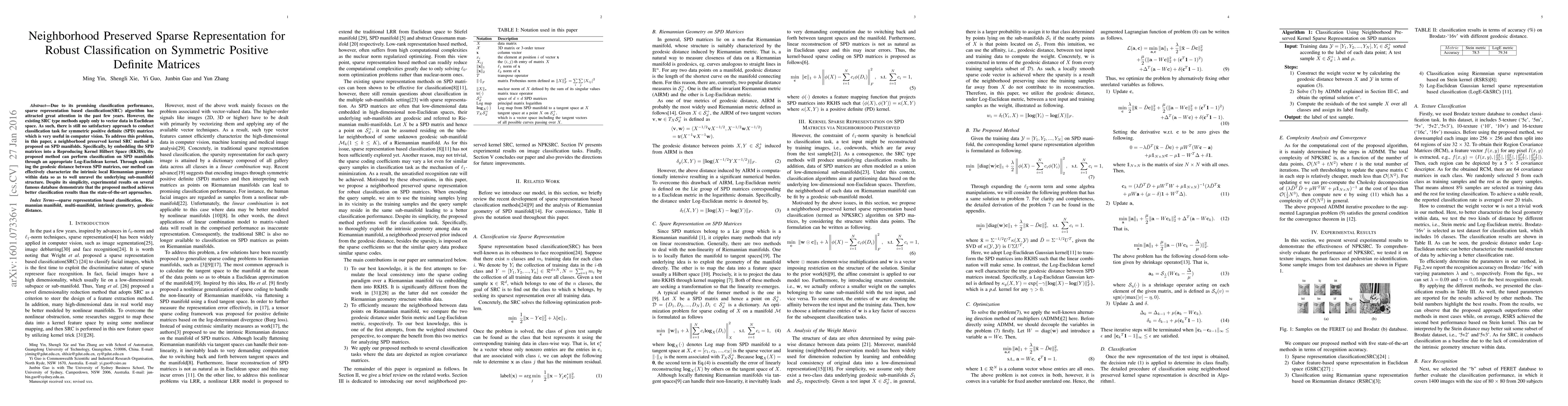 This paper proposes a neighborhood preserved sparse representation classification method for symmetric positive definite matrices on SPD manifolds, embedding them into a Reproducing Kernel Hilbert Space for improved classification performance. The method leverages the geodesic distance to characterize intrinsic local Riemannian geometry, achieving superior classification results compared to state-of-the-art approaches.