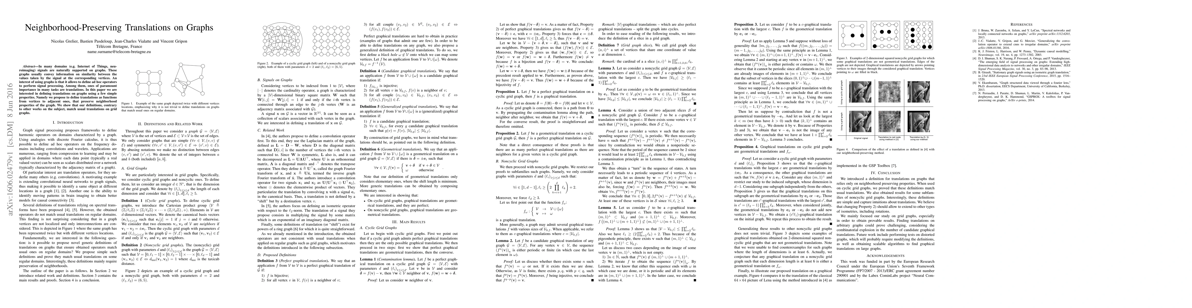 In many domains (e.g. Internet of Things, neuroimaging) signals are naturally supported on graphs. These graphs usually convey information on similarity between the values taken by the signal at the corresponding vertices. An interest of using graphs is that it allows to define ad hoc operators to perform signal processing. Among them, ones of paramount importance in many tasks are translations. In this paper we are interested in defining translations on graphs using a few simple properties. Namely we propose to define translations as functions from vertices to adjacent ones, that preserve neighborhood properties of the graph. We show that our definitions, contrary to other works on the subject, match usual translations on grid graphs.