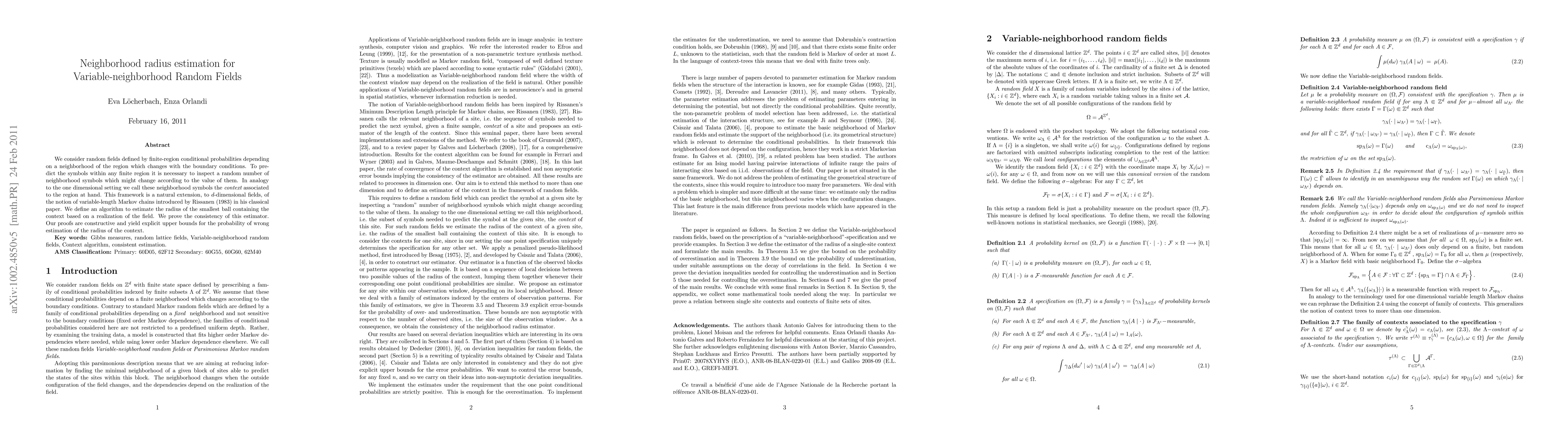 This paper proposes an algorithm for estimating the radius of the smallest ball encompassing the context in variable-neighborhood Random Fields, extending the concept of variable-length Markov chains to d-dimensional fields. The authors prove the consistency of the estimator and provide explicit upper bounds on the probability of incorrect radius estimation.