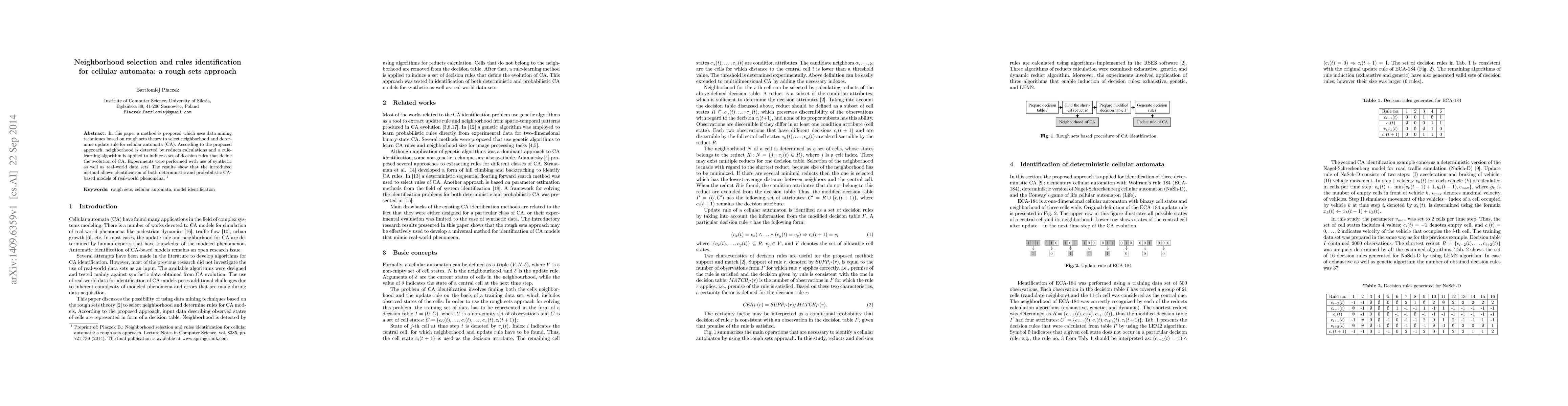 A method using rough sets theory is proposed to select neighborhood and determine update rules for cellular automata, successfully identifying both deterministic and probabilistic models of real-world phenomena.