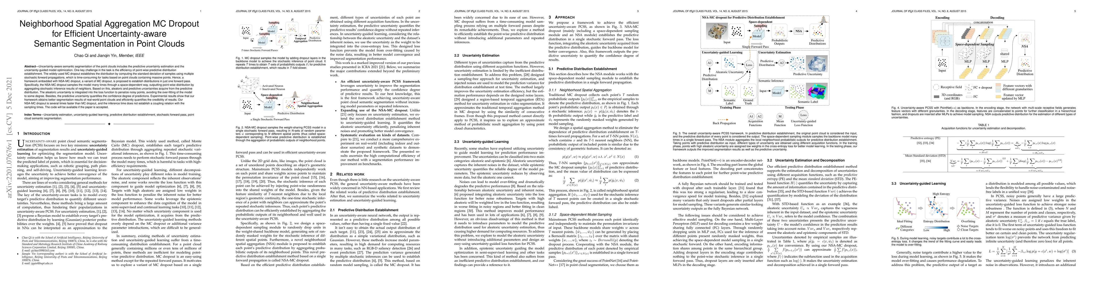 This paper proposes NSA-MC dropout, a novel framework for efficient uncertainty-aware semantic segmentation in point clouds, which aggregates stochastic inference results of neighbors in one forward pass to establish point-wise predictive distributions, significantly speeding up the process compared to traditional MC dropout. The framework also integrates aleatoric uncertainty into the loss function to improve model robustness.