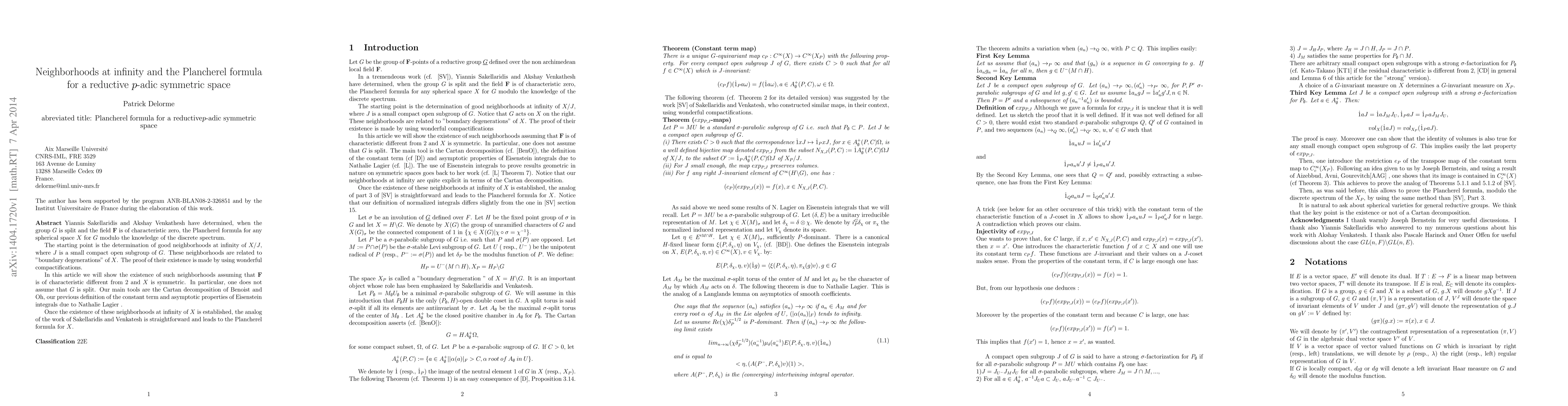 Yiannis Sakellaridis and Akshay Venkathesh have determined, when the group $G$ is split and the field $\F$ is of characteristic zero, the Plancherel formula for any spherical space $X$ for $G$ modulo the knowledge of the discrete spectrum. The starting point is the determination of good neighborhoods at infinity of $X/J$, where $J$ is a small compact open subgroup of $G$. These neighborhoods are related to "boundary degenerations" of $X$. The proof of their existence is made by using wonderful compactifications. In this article we will show the existence of such neighborhoods assuming that $\F$ is of characteristic different from 2 and $X$ is symmetric. In particular, one does not assume that $G$ is split. Our main tools are the Cartan decomposition of Benoist and Oh, our previous definition of the constant term and asymptotic properties of Eisenstein integrals due to Nathalie Lagier . Once the existence of these neighborhoods at infinity of $X$ is established, the analog of the work of Sakellaridis and Venkatesh is straightforward and leads to the Plancherel formula for $X$.