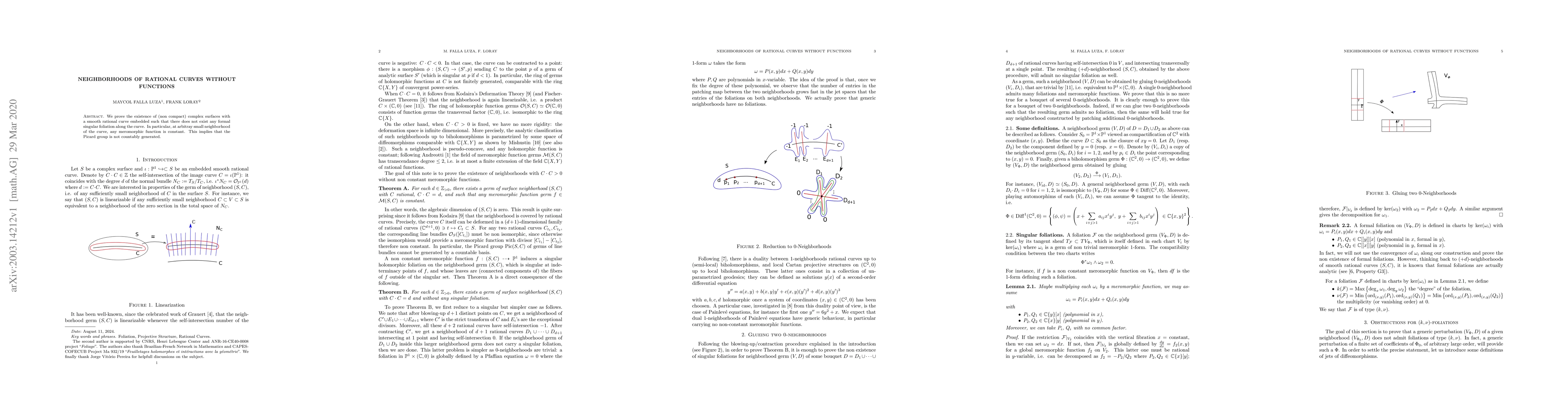 Researchers prove the existence of complex surfaces with embedded rational curves that prevent formal singular foliations, leading to non-countably generated Picard groups and constant meromorphic functions in small neighborhoods.