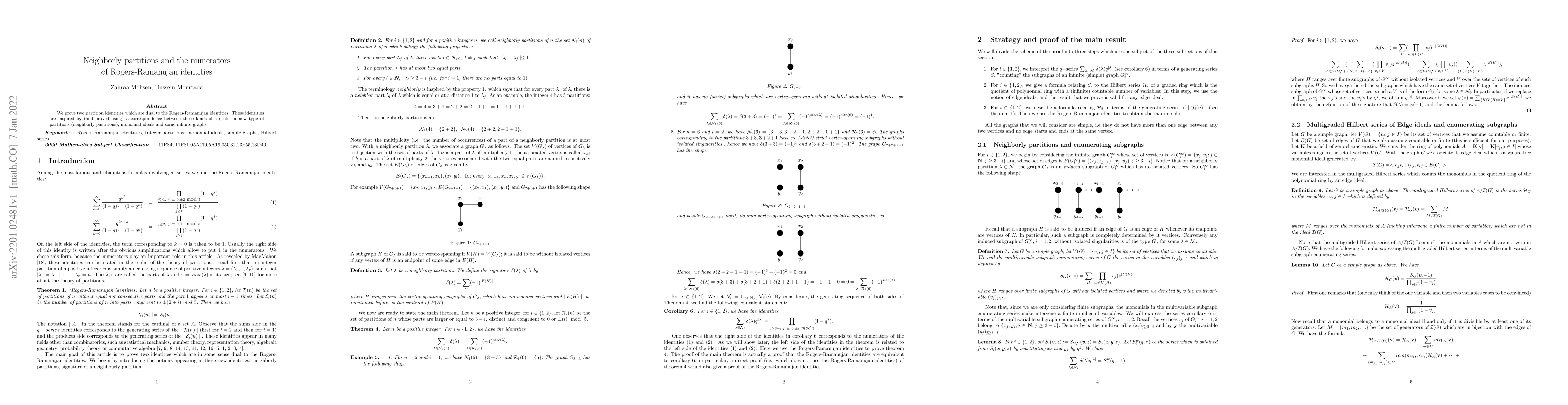 Summary: The paper establishes two partition identities, dual to the Rogers-Ramanujan identities, through a correspondence linking neighborly partitions, monomial ideals, and specific infinite graphs. These findings offer new insights into the structure of partition theory.