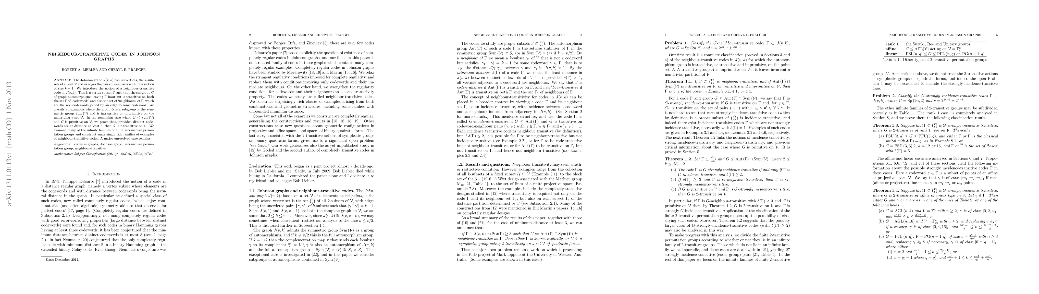 This paper introduces the concept of neighbour-transitive codes in Johnson graphs, classifying such codes when the graph automorphism group is intransitive or imprimitive, and proving that for primitive groups, if distinct codewords are at least distance 3, the group is 2-transitive. It constructs rich families of examples but leaves one major case unresolved.
