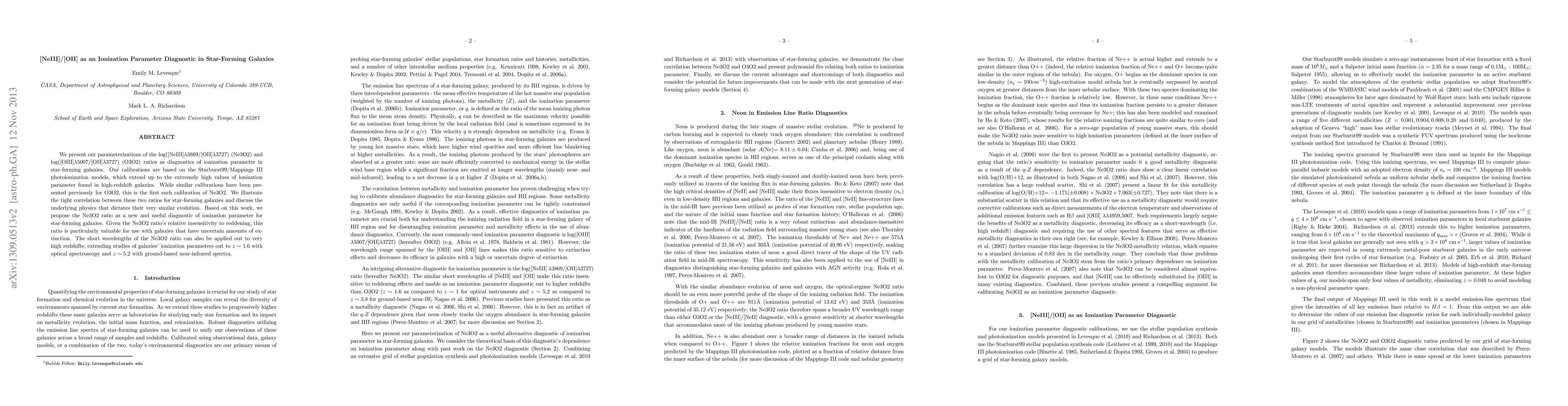 This paper presents new parameterizations for the [NeIII]/[OII] and [OIII]/[OII] ratios as effective diagnostics of ionization parameters in star-forming galaxies, based on recent photoionization models. The Ne3O2 ratio is proposed as a valuable alternative due to its insensitivity to reddening and applicability to high-redshift galaxies.