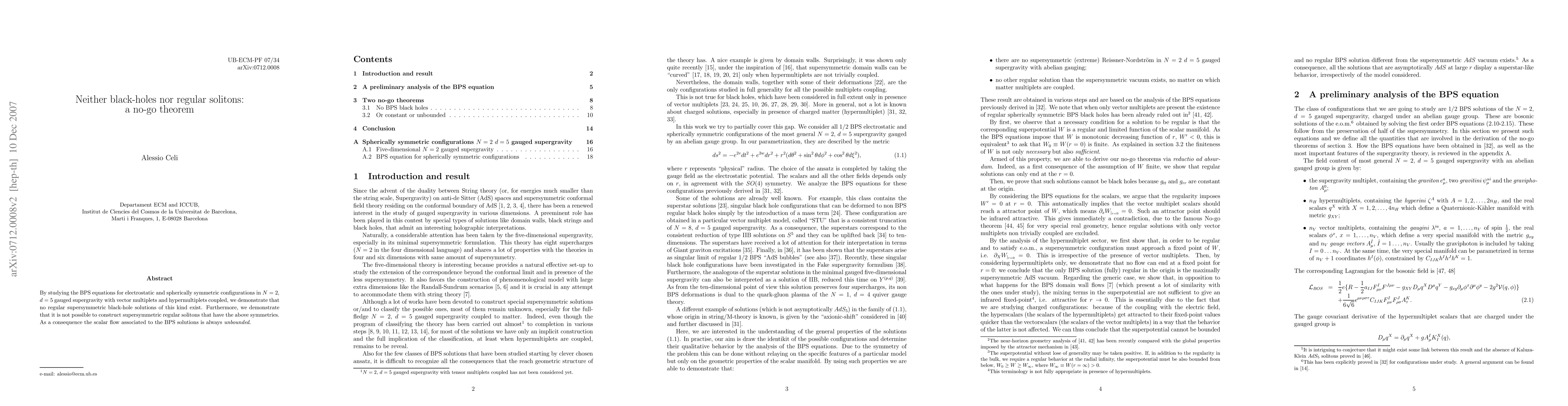 This paper proves that in N=2, d=5 gauged supergravity, there are no regular supersymmetric black-hole solutions or regular solitons with the specified symmetries, leading to unbounded scalar flow in BPS solutions.
