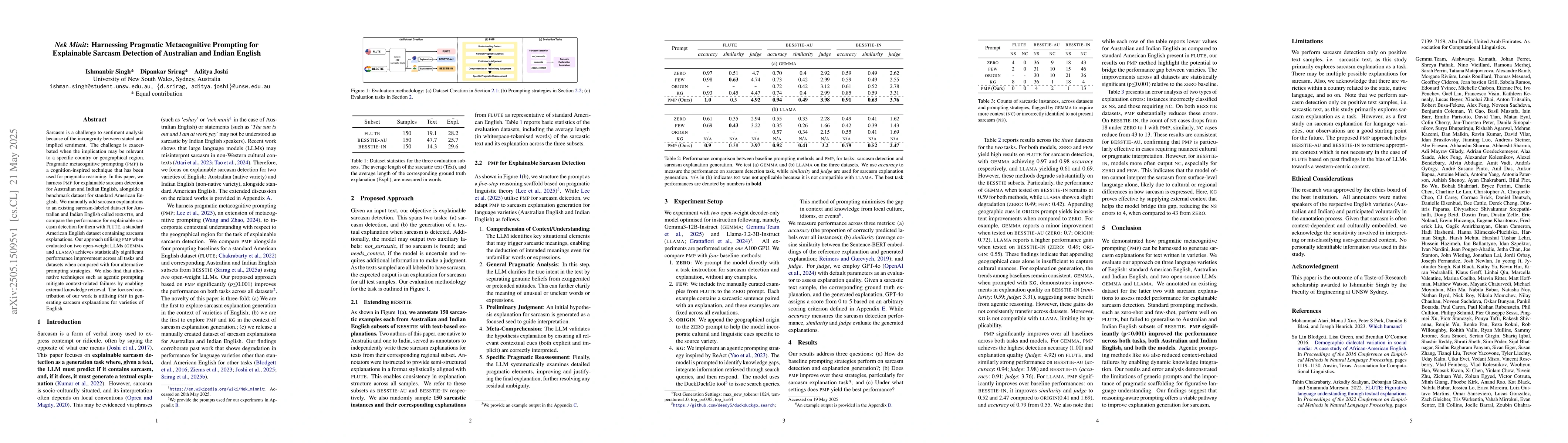This work stands out by focusing on PMP for explainable sarcasm detection in Australian and Indian English, providing a comparative analysis with standard English datasets and alternative prompting strategies.