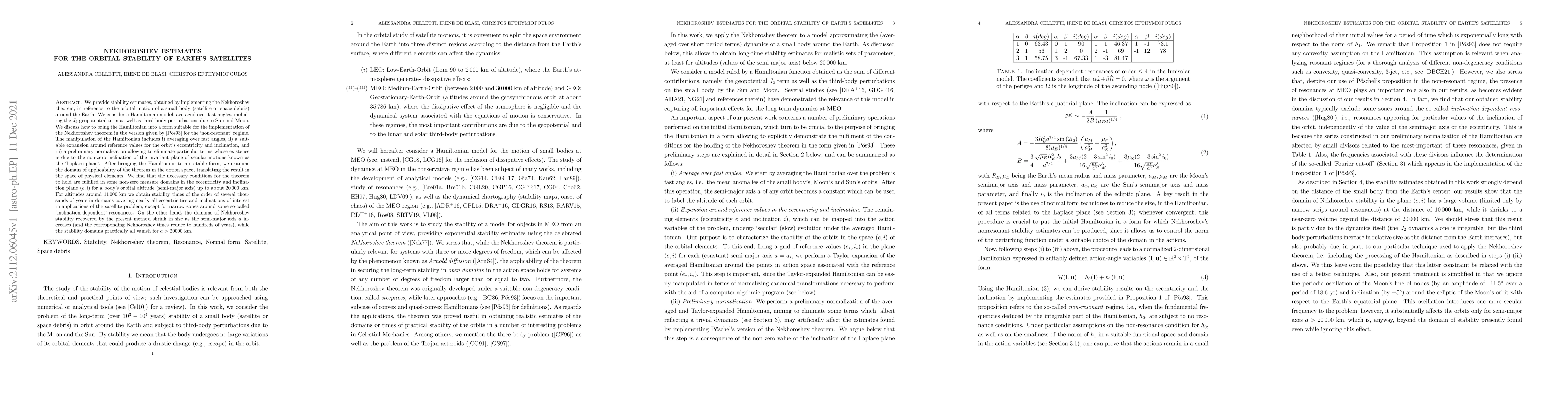 This paper applies Nekhoroshev's theorem to estimate the orbital stability of Earth's satellites, considering perturbations from the $J_2$ geopotential and third-body effects. The authors find stability for several thousands of years up to 11,000 km altitude, but stability domains diminish for higher altitudes, with no significant stability beyond 20,000 km.