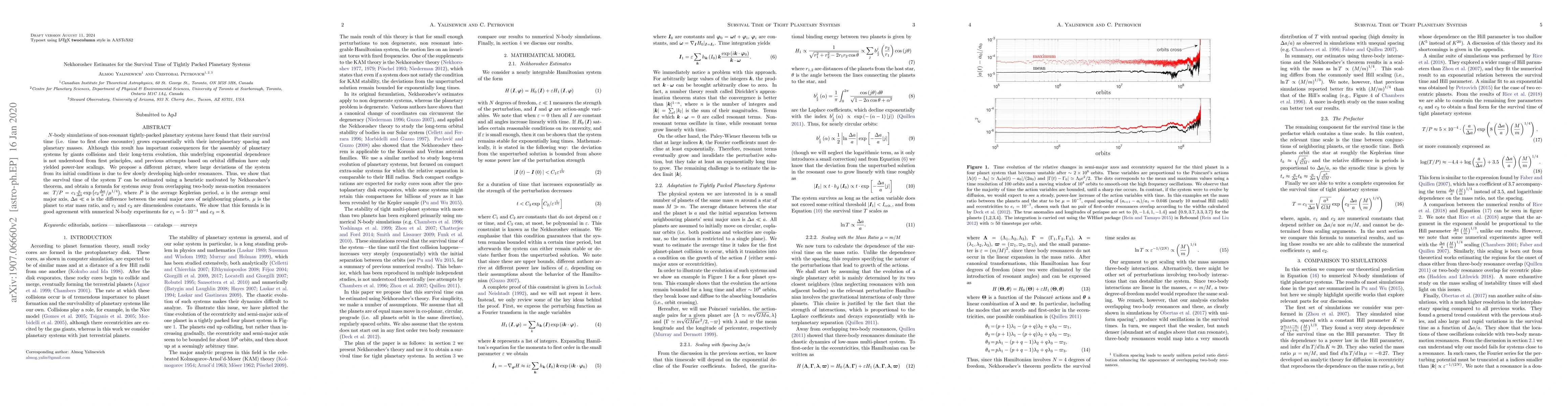 This paper proposes a new method to estimate the survival time of tightly packed planetary systems using Nekhoroshev's theorem, showing that the survival time grows exponentially with interplanetary spacing and planetary masses. The derived formula aligns well with $N$-body simulations, providing a better understanding of the long-term stability of such systems.