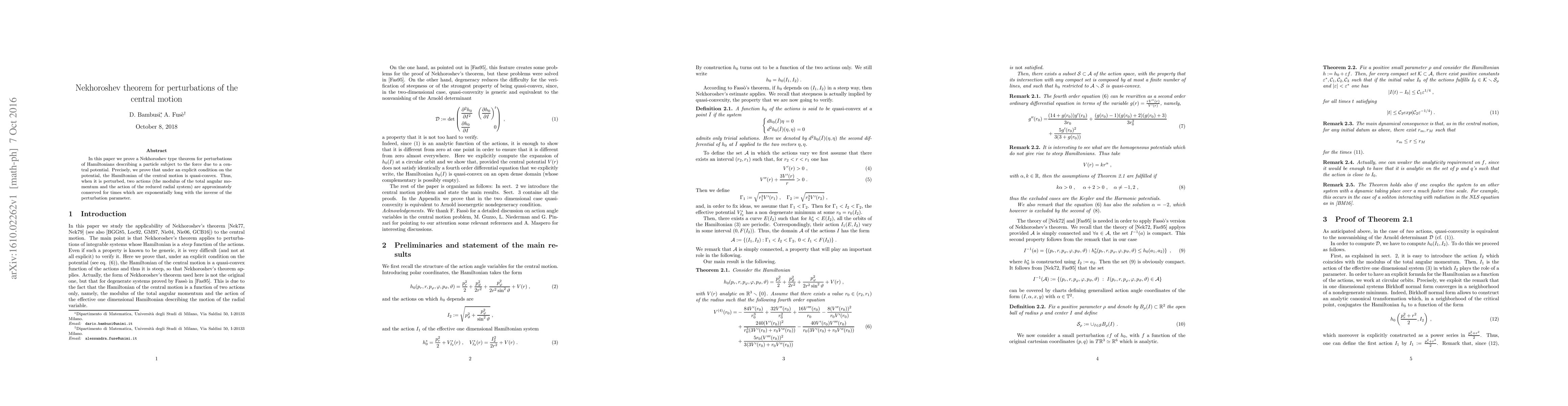 This paper proves a Nekhoroshev-type theorem for Hamiltonians describing a particle under a central potential, showing that under specific conditions, the central motion's Hamiltonian is quasi-convex. Consequently, perturbations lead to approximate conservation of two actions for exponentially long times relative to the inverse of the perturbation parameter.