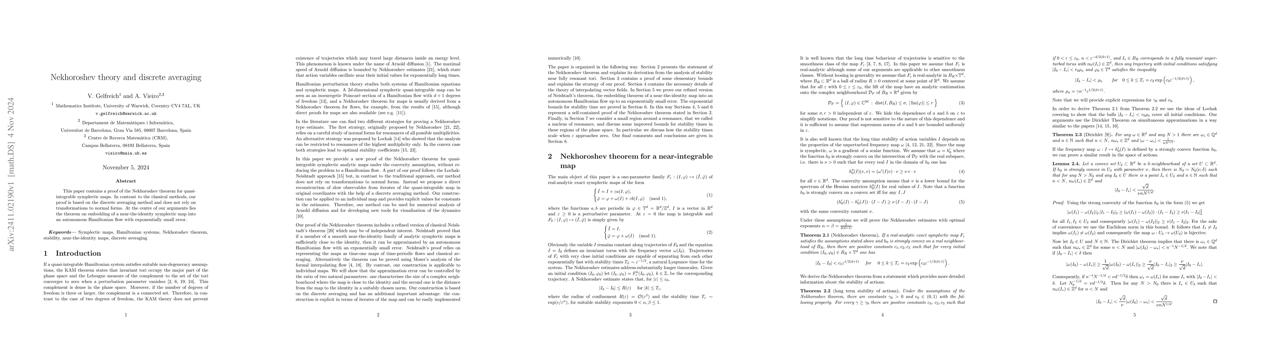 The paper introduces a novel proof technique based on discrete averaging for the Nekhoroshev theorem, avoiding the need for normal form transformations.
