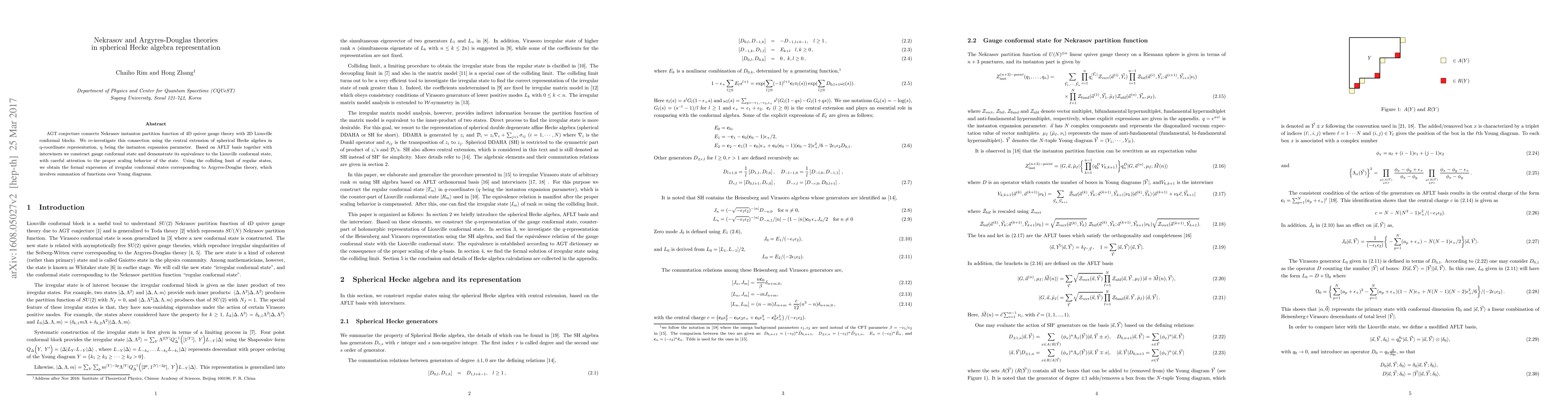 This paper explores the AGT conjecture by linking Nekrasov's instanton partition function in 4D quiver gauge theory to 2D Liouville conformal blocks through the representation of the spherical Hecke algebra. It constructs gauge conformal states using the AFLT basis and interwiners, demonstrating their equivalence to Liouville conformal states and deriving expressions for irregular conformal states in Argyres-Douglas theory via a summation over Young diagrams.
