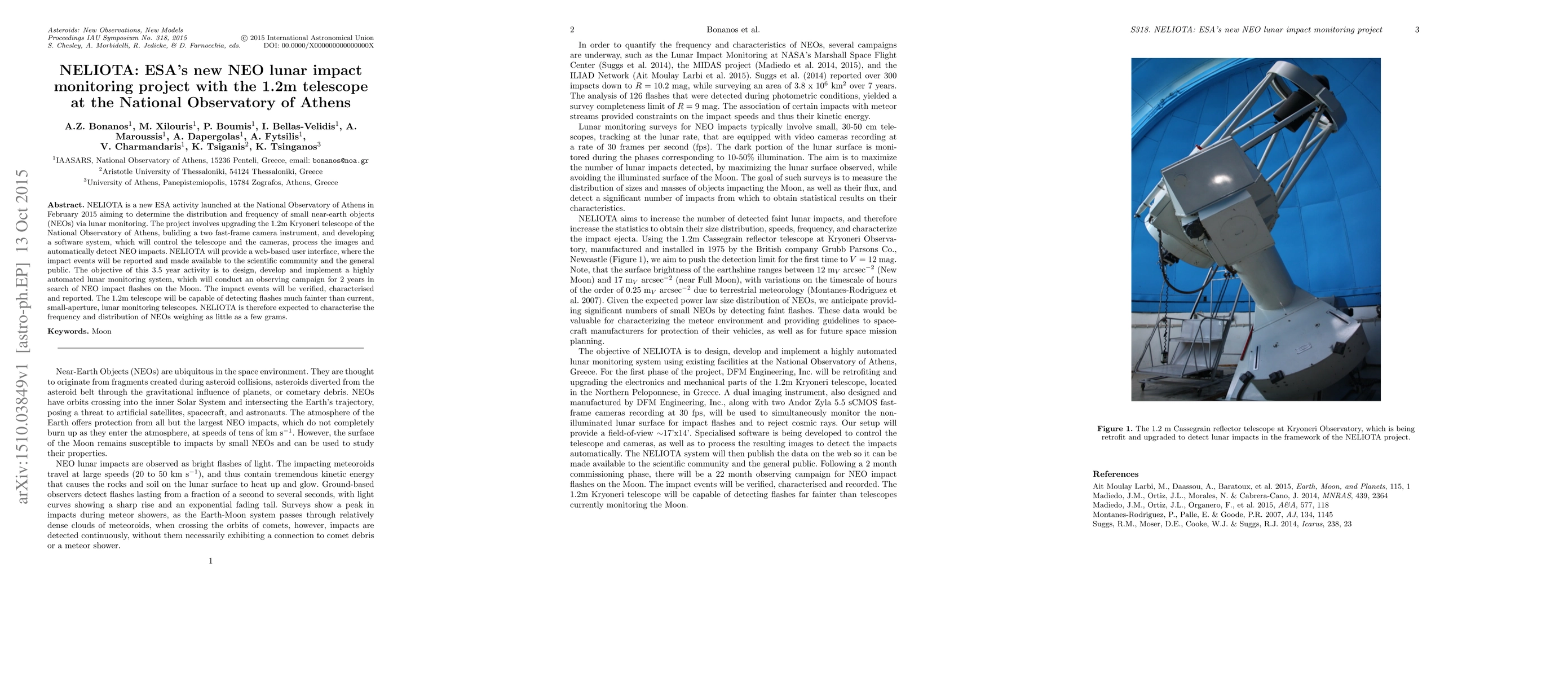 NELIOTA is an ESA project launched in 2015 to monitor lunar impacts from small near-Earth objects (NEOs) using the upgraded 1.2m Kryoneri telescope at the National Observatory of Athens. The project aims to develop an automated system to detect and report NEO impacts, providing data to the scientific community and public.