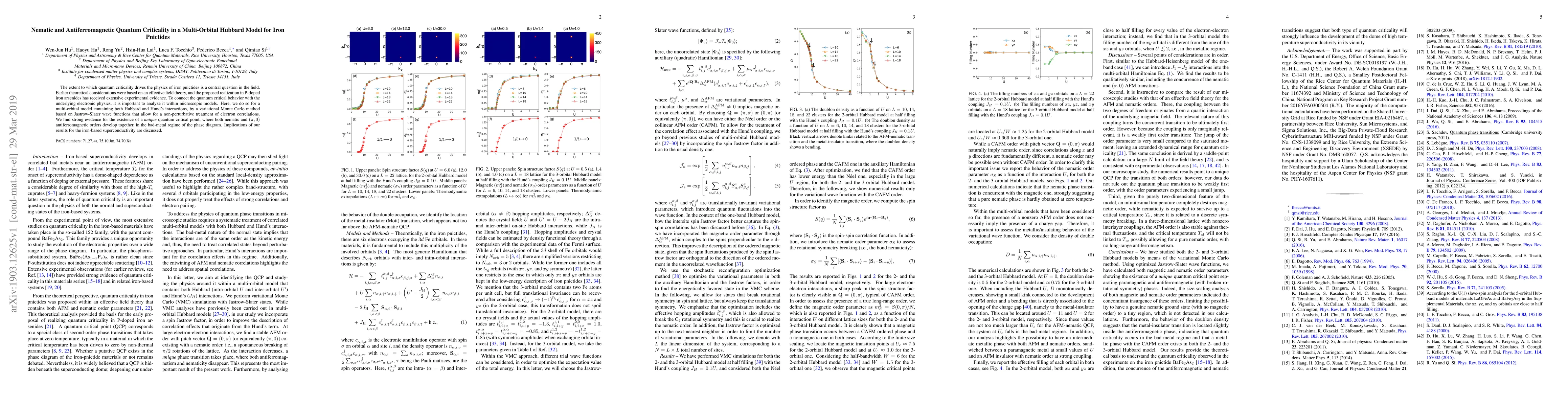 This paper investigates the quantum criticality in iron pnictides using a multi-orbital Hubbard model, revealing a unique critical point where nematic and antiferromagnetic orders coexist. The study employs variational Monte Carlo methods to explore electron correlations, providing insights into the underlying physics and implications for superconductivity.