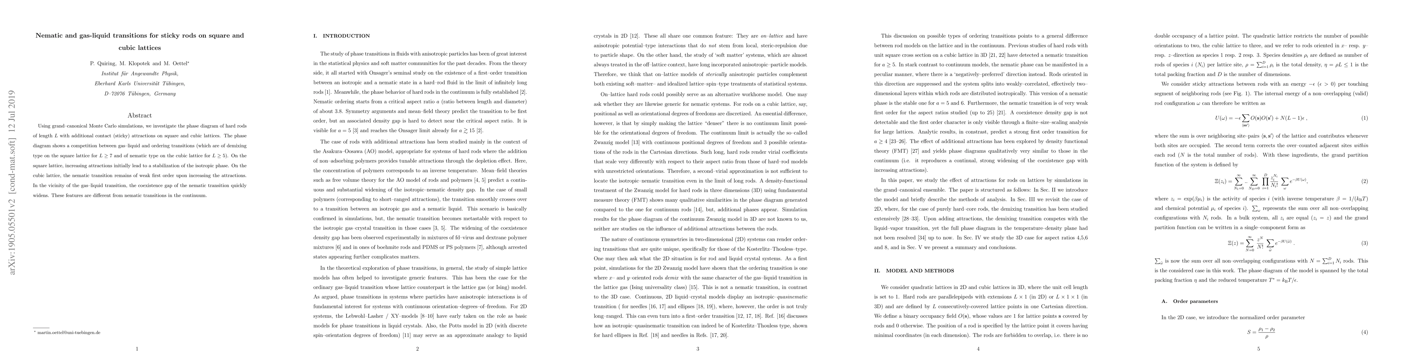 Using grand-canonical Monte Carlo simulations, we investigate the phase diagram of hard rods of length $L$ with additional contact (sticky) attractions on square and cubic lattices. The phase diagram shows a competition between gas-liquid and ordering transitions (which are of demixing type on the square lattice for $L \ge 7$ and of nematic type on the cubic lattice for $L \ge 5$). On the square lattice, increasing attractions initially lead to a stabilization of the isotropic phase. On the cubic lattice, the nematic transition remains of weak first order upon increasing the attractions. In the vicinity of the gas-liquid transition, the coexistence gap of the nematic transition quickly widens. These features are different from nematic transitions in the continuum.