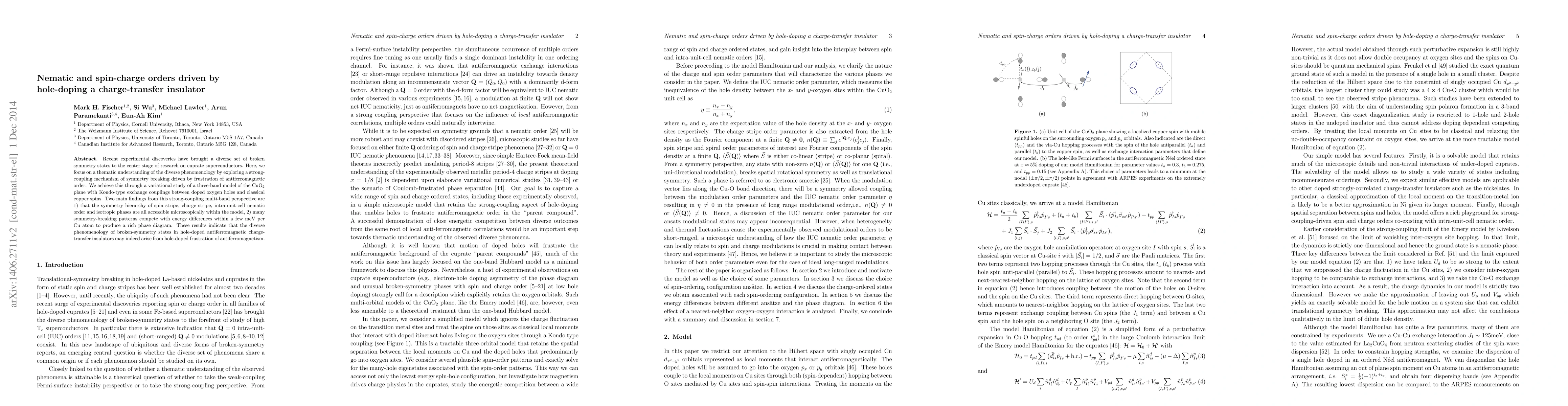 Recent experimental discoveries have brought a diverse set of broken symmetry states to the center stage of research on cuprate superconductors. Here, we focus on a thematic understanding of the diverse phenomenology by exploring a strong-coupling mechanism of symmetry breaking driven by frustration of antiferromagnetic order. We achieve this through a variational study of a three-band model of the CuO$_2$ plane with Kondo-type exchange couplings between doped oxygen holes and classical copper spins. Two main findings from this strong-coupling multi-band perspective are 1) that the symmetry hierarchy of spin stripe, charge stripe, intra-unit-cell nematic order and isotropic phases are all accessible microscopically within the model, 2) many symmetry-breaking patterns compete with energy differences within a few meV per Cu atom to produce a rich phase diagram. These results indicate that the diverse phenomenology of broken-symmetry states in hole-doped antiferromagnetic charge-transfer insulators may indeed arise from hole-doped frustration of antiferromagnetism.