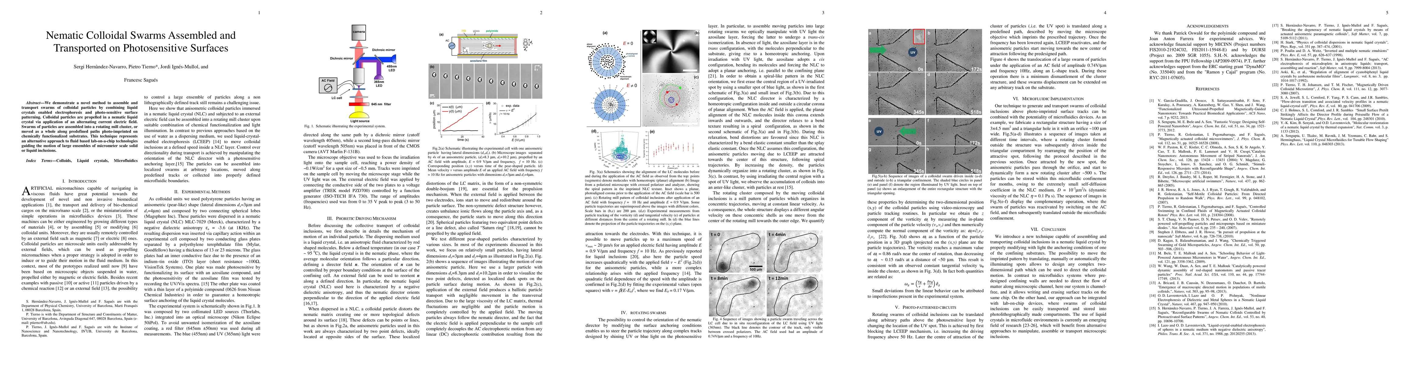 This paper presents a method to assemble and transport swarms of colloidal particles using nematic liquid crystals and photo-sensitive surface patterning, enabling the formation of rotating mill clusters or movement along predefined paths. This technique offers an alternative to fluid-based lab-on-a-chip technologies for guiding micrometer-scale inclusions.