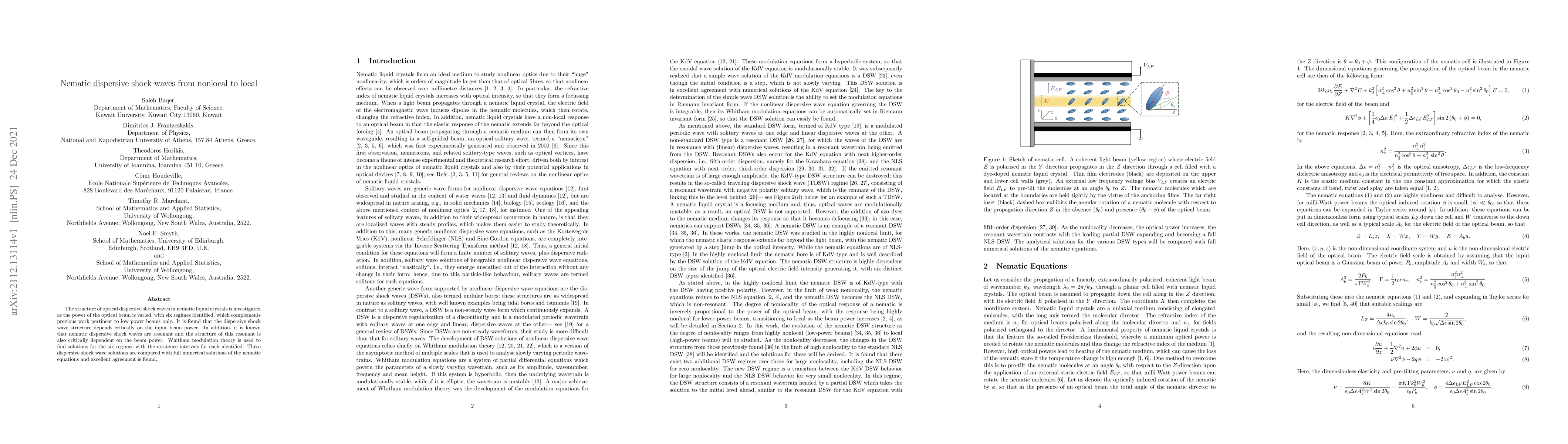 This paper investigates the structure of optical dispersive shock waves in nematic liquid crystals across varying beam powers, identifying six regimes. The study reveals that the shock wave's structure and resonance are critically dependent on input beam power, with Whitham modulation theory providing solutions that match numerical simulations.