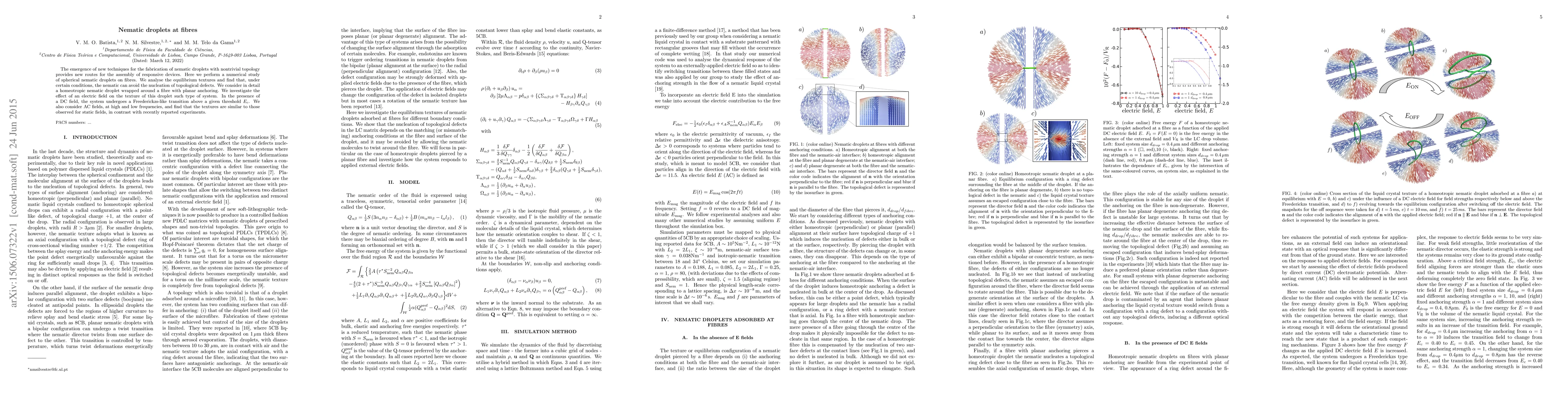 This paper numerically investigates the equilibrium textures of nematic droplets on fibres, finding that under specific conditions, the nematic can prevent topological defects. The study also explores the effects of both DC and AC electric fields on the texture of a homeotropic nematic droplet, revealing a Freederickzs-like transition above a critical field strength.