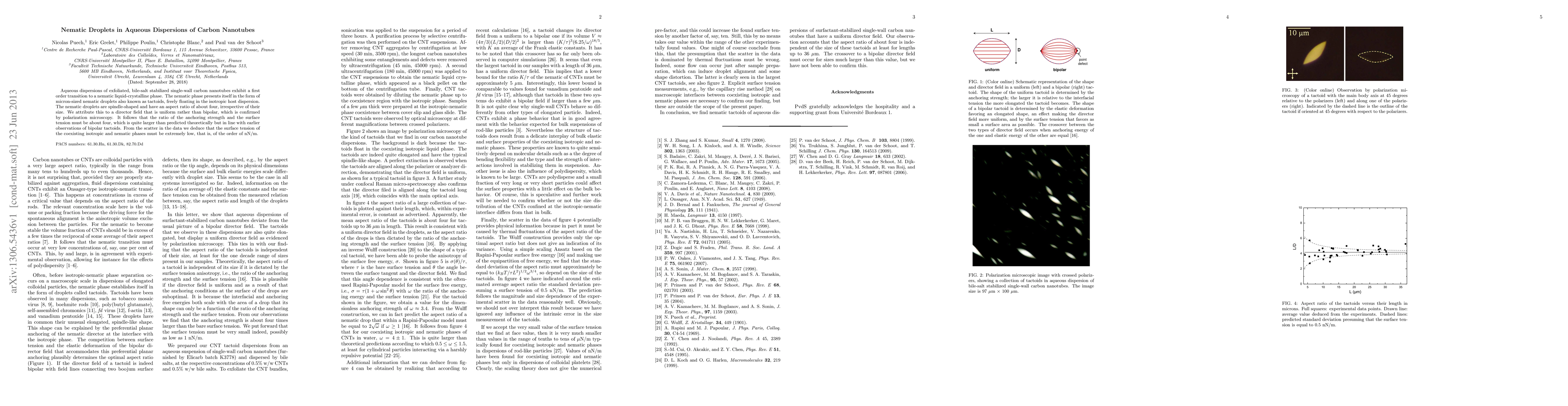 This study reveals that aqueous dispersions of single-wall carbon nanotubes transition to a nematic liquid-crystalline phase, forming spindle-shaped nematic droplets. The uniform director field and low surface tension of these droplets suggest a strong anchoring strength, deviating from theoretical predictions.
