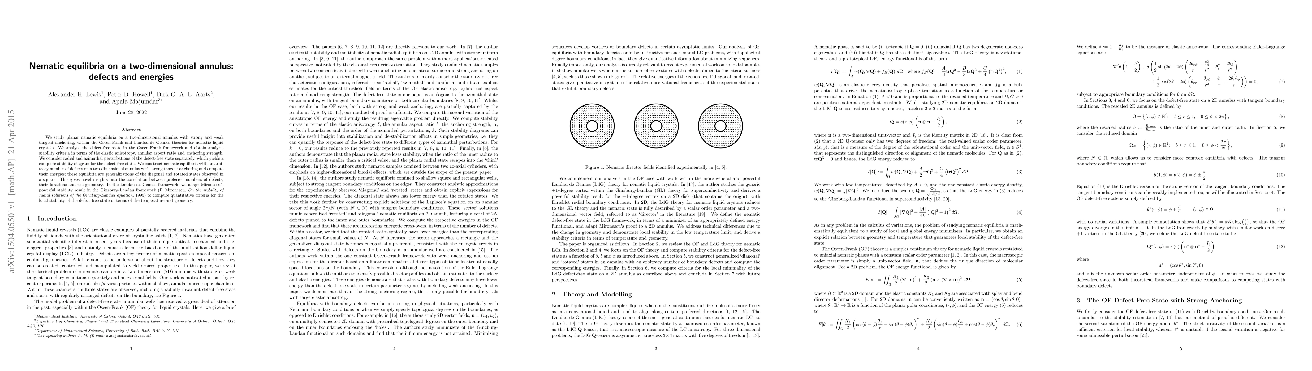 We study planar nematic equilibria on a two-dimensional annulus with strong and weak tangent anchoring, within the Oseen-Frank and Landau-de Gennes theories for nematic liquid crystals. We analyse the defect-free state in the Oseen-Frank framework and obtain analytic stability criteria in terms of the elastic anisotropy, annular aspect ratio and anchoring strength. We consider radial and azimuthal perturbations of the defect-free state separately, which yields a complete stability diagram for the defect-free state. We construct nematic equilibria with an arbitrary number of defects on a two-dimensional annulus with strong tangent anchoring and compute their energies; these equilibria are generalizations of the diagonal and rotated states observed in a square. This gives novel insights into the correlation between preferred numbers of defects, their locations and the geometry. In the Landau-de Gennes framework, we adapt Mironescu's powerful stability result in the Ginzburg-Landau framework (P. Mironescu, On the stability of radial solutions of the Ginzburg-Landau equation, 1995) to compute quantitative criteria for the local stability of the defect-free state in terms of the temperature and geometry.