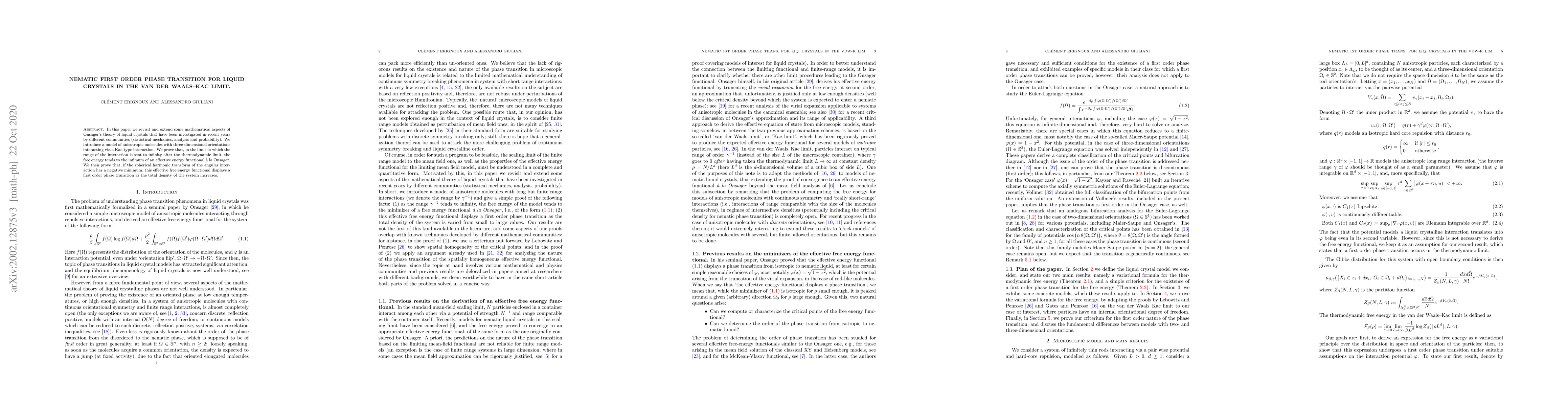 In this paper we revisit and extend some mathematical aspects of Onsager's theory of liquid crystals that have been investigated in recent years by different communities (statistical mechanics, analysis and probability). We introduce a model of anisotropic molecules with three-dimensional orientations interacting via a Kac-type interaction. We prove that, in the limit in which the range of the interaction is sent to infinity after the thermodynamic limit, the free energy tends to the infimum of an effective energy functional \`a la Onsager. We then prove that, if the spherical harmonic transform of the angular interaction has a negative minimum, this effective free energy functional displays a first order phase transition as the total density of the system increases.