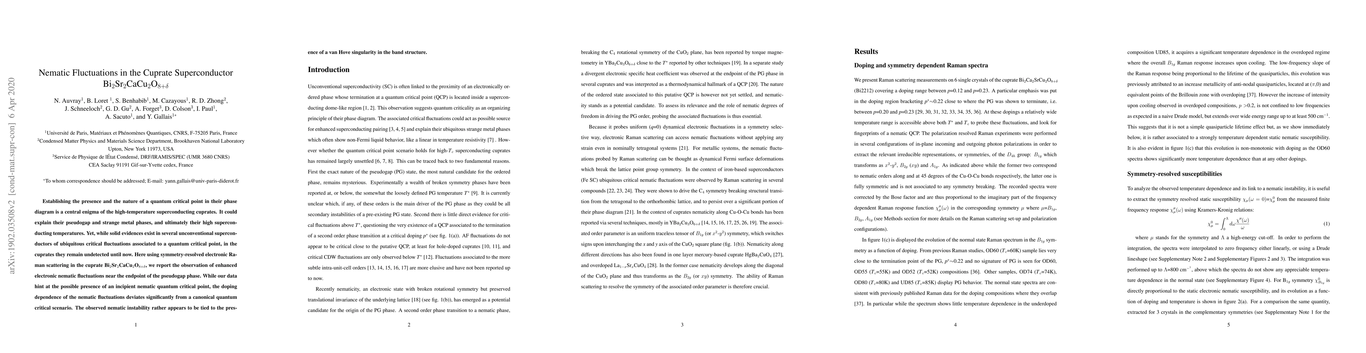 This paper reports the detection of enhanced electronic nematic fluctuations in the cuprate superconductor Bi$_2$Sr$_2$CaCu$_2$O$_{8+\delta}$ using Raman scattering, suggesting an incipient nematic quantum critical point near the pseudogap phase. However, the doping dependence of these fluctuations diverges from a typical quantum critical scenario, indicating a connection to a van Hove singularity instead.