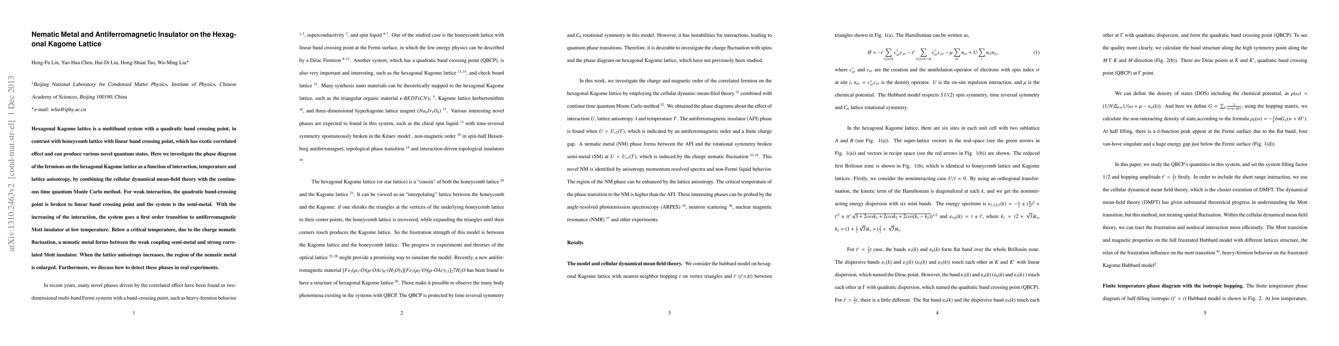 This paper explores the phase diagram of fermions on a hexagonal Kagome lattice, revealing the emergence of a nematic metal and antiferromagnetic insulator phases through interactions, temperature, and lattice anisotropy. The study combines cellular dynamical mean-field theory with quantum Monte Carlo methods to predict these novel quantum states.