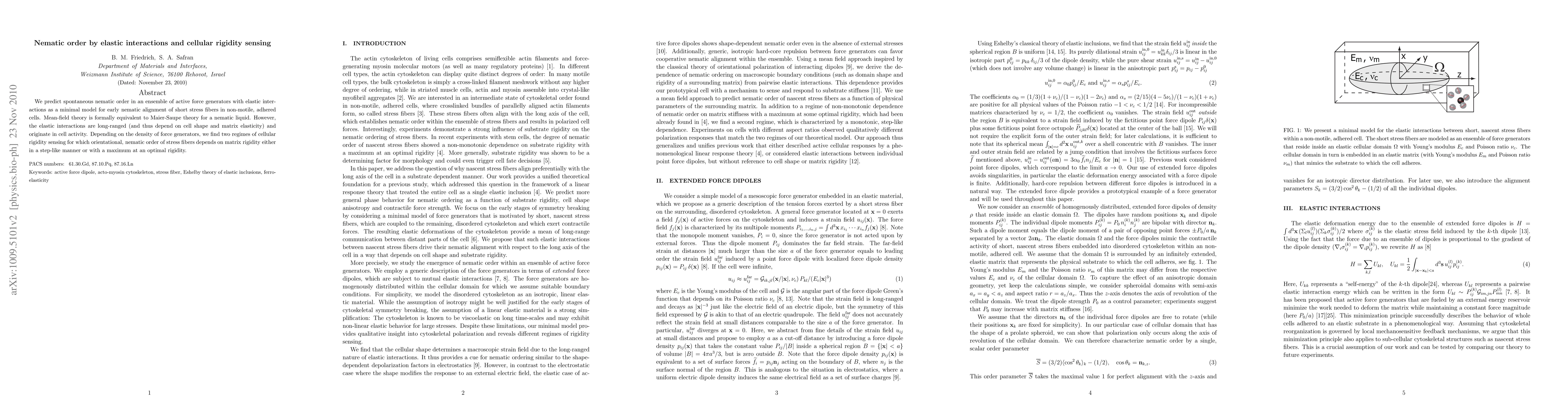 Researchers predict that active force generators with elastic interactions can lead to spontaneous nematic order in cells, depending on cellular rigidity sensing and matrix elasticity.