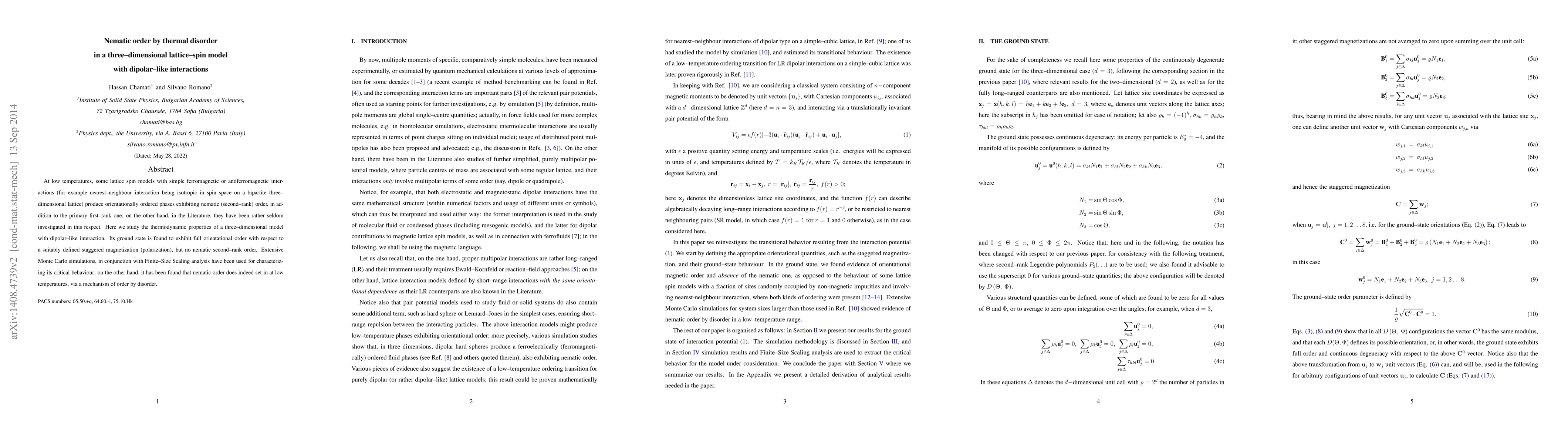 At low temperatures, some lattice spin models with simple ferromagnetic or antiferromagnetic interactions (for example nearest-neighbour interaction being isotropic in spin space on a bipartite three-dimensional lattice) produce orientationally ordered phases exhibiting nematic (second--rank) order, in addition to the primary first-rank one; on the other hand, in the Literature, they have been rather seldom investigated in this respect. Here we study the thermodynamic properties of a three-dimensional model with dipolar-like interaction. Its ground state is found to exhibit full orientational order with respect to a suitably defined staggered magnetization (polarization), but no nematic second-rank order. Extensive Monte Carlo simulations, in conjunction with Finite-Size Scaling analysis have been used for characterizing its critical behaviour; on the other hand, it has been found that nematic order does indeed set in at low temperatures, via a mechanism of order by disorder.