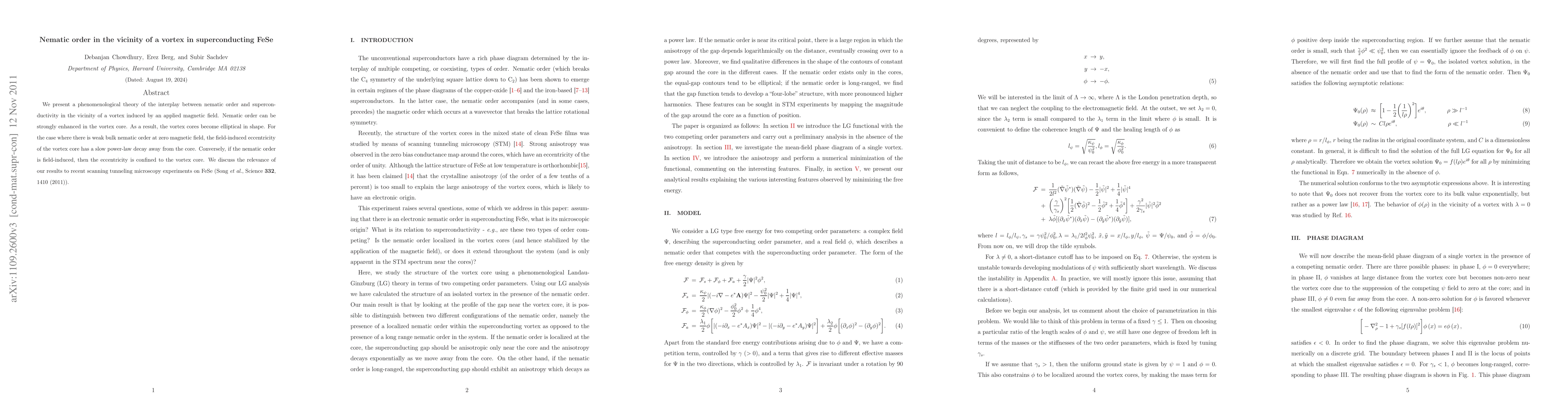 This paper develops a theory explaining how nematic order interacts with superconductivity near a vortex in FeSe, showing that nematic order can enhance in the vortex core, leading to elliptical vortex shapes. The study also discusses the decay of vortex core eccentricity depending on whether the nematic order is pre-existing or induced by the magnetic field.