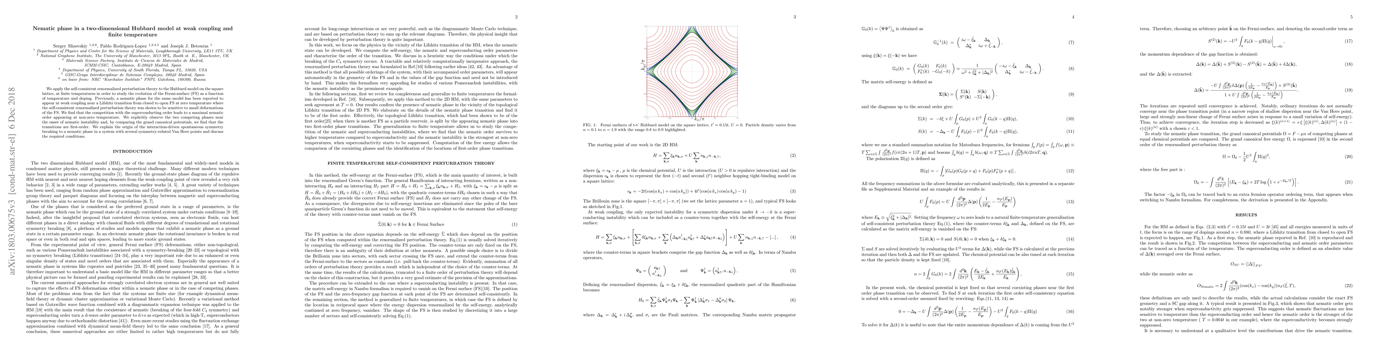 This paper uses self-consistent renormalized perturbation theory to investigate the nematic phase in a two-dimensional Hubbard model at finite temperatures and weak coupling. It finds that the nematic phase, which emerges due to competition with superconductivity, maximizes at non-zero temperatures and exhibits first-order transitions near the onset of nematic instability.