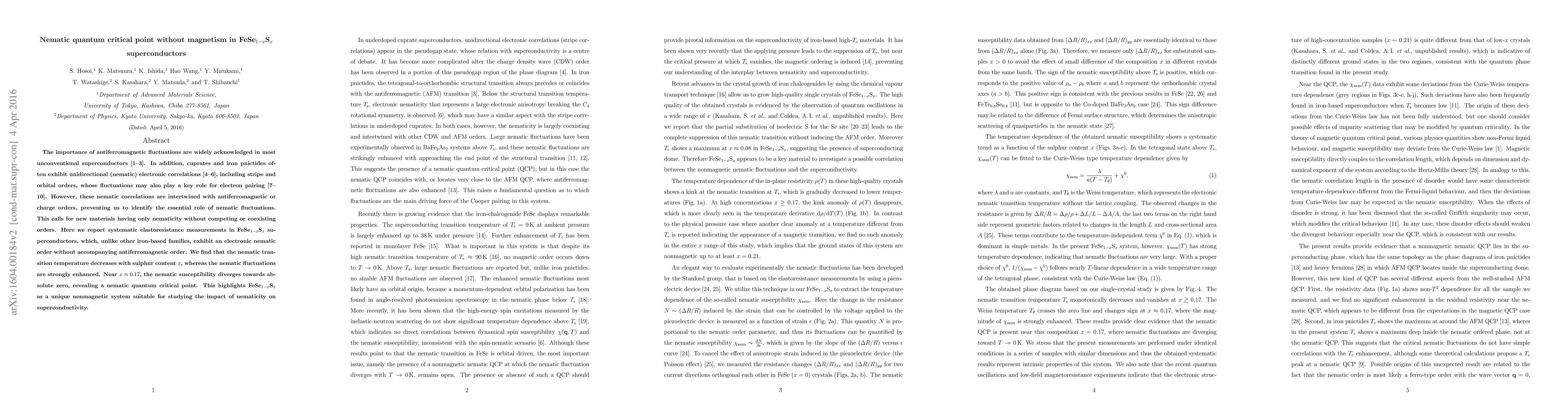 This paper reports on FeSe$_{1-x}$S$_{x}$ superconductors, which exhibit a nematic quantum critical point without accompanying antiferromagnetic order, providing a unique platform to study the role of nematic fluctuations in superconductivity independent of magnetic interactions. The nematic transition temperature decreases with increasing sulphur content, and a nematic quantum critical point is observed near $x\approx0.17$.