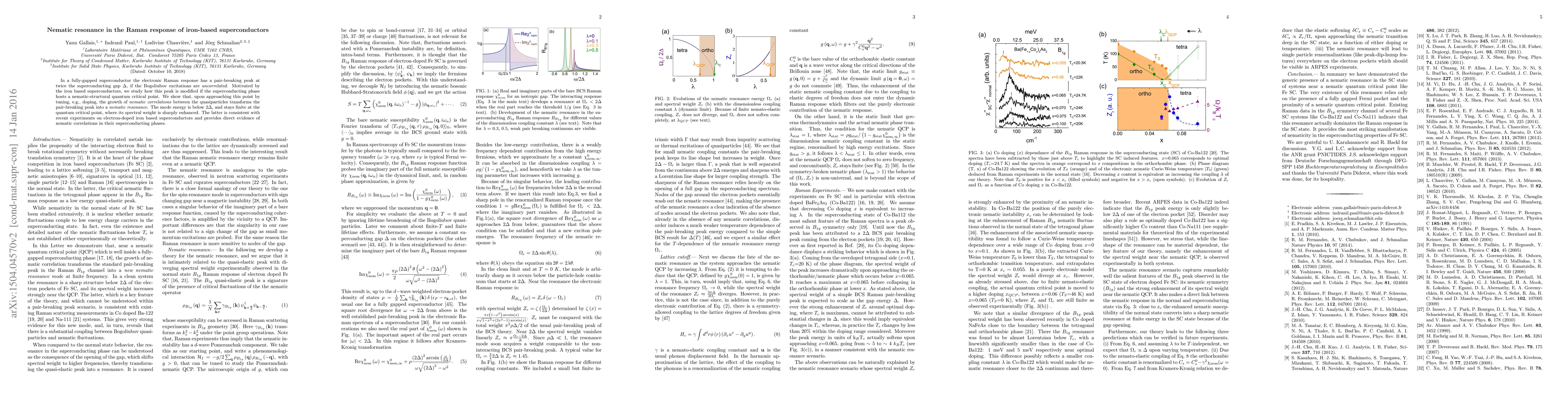 This paper investigates the modification of the pair-breaking peak in the Raman response of iron-based superconductors when a nematic-structural quantum critical point is approached. It reveals that nematic correlations transform the peak into a nematic resonance, which remains finite and is sharply enhanced at the critical point, aligning with recent experimental findings.