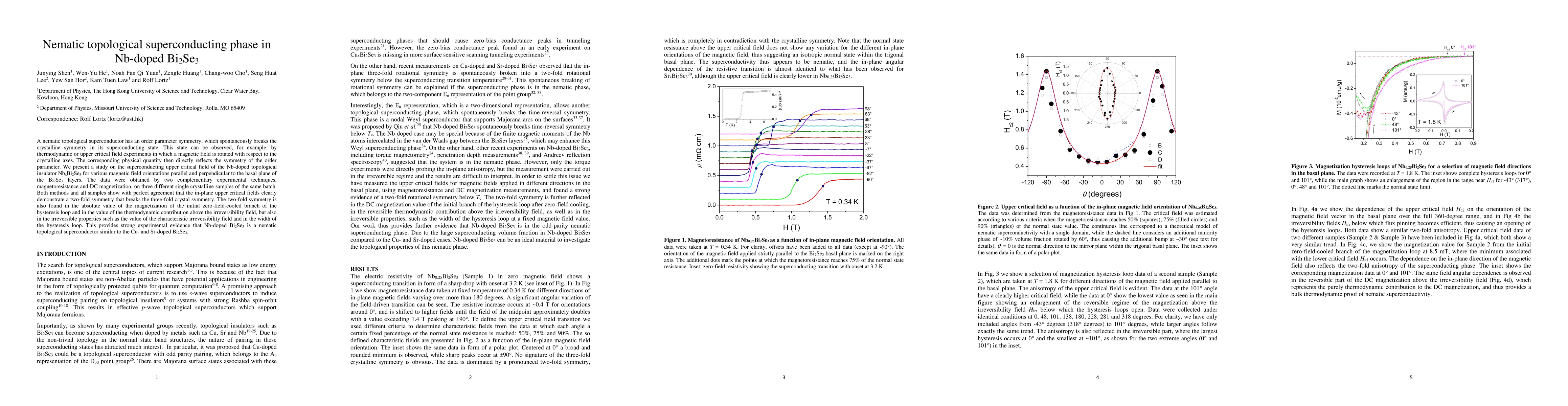 This study demonstrates that Nb-doped Bi2Se3 exhibits a nematic topological superconducting phase, characterized by a two-fold symmetry in the upper critical field, which breaks the material's three-fold crystal symmetry. The findings, obtained via magnetoresistance and DC magnetization, provide strong evidence for this unique superconducting state.